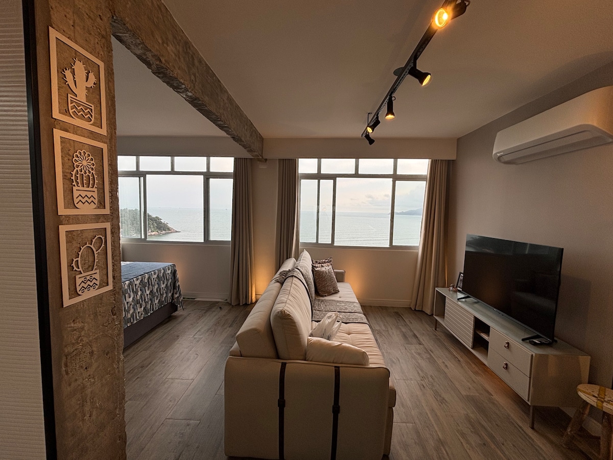 Stiúideo álainn le radhairc IONTACHA ar an aigéan,báid (longa, báid luais, báid seoil, scairdeanna, seastán suas); droichead crochta agus luí na gréine iontach. Lonnaithe in aice leis an mbialann agus an choperia "Terrace" le gastranómachas iontach, radharc lánléargais ar an santista íochtarach, ceol beo agus atmaisféar teolaí. In aice láimhe tá turais bháid againn, cnoc Asa Delta, malls siopadóireachta, emissary, carr cábla, cuairt ar uisceadán Santos, turas tralaí, cearnóg brataí, cosán rothar agus síocháin