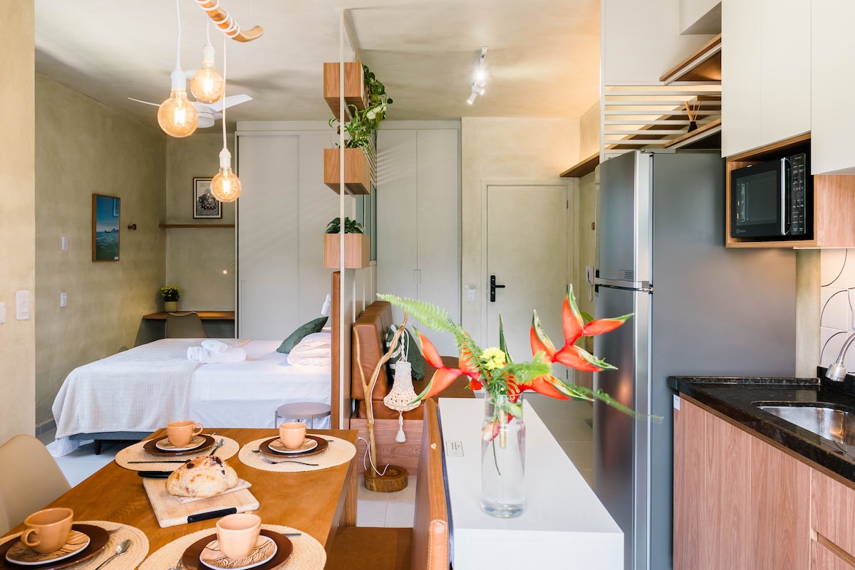 Studio novo com projeto assinado por arquiteta, muito lindo e confortável. Está à 400m da Orla da Praia do Perequê Açú. Contamos com: TV smart, Wi-fi de fibra ótica, espaço próprio para trabalhar, cozinha equipada, churrasqueira na varanda e uma vista deslumbrante da Mata Atlântica. No prédio temos piscina, forno para pizza, ducha e garagem com portão eletrônico. Está muito bem localizado, perto do Centro e Rua Turística, além da Rodovia.