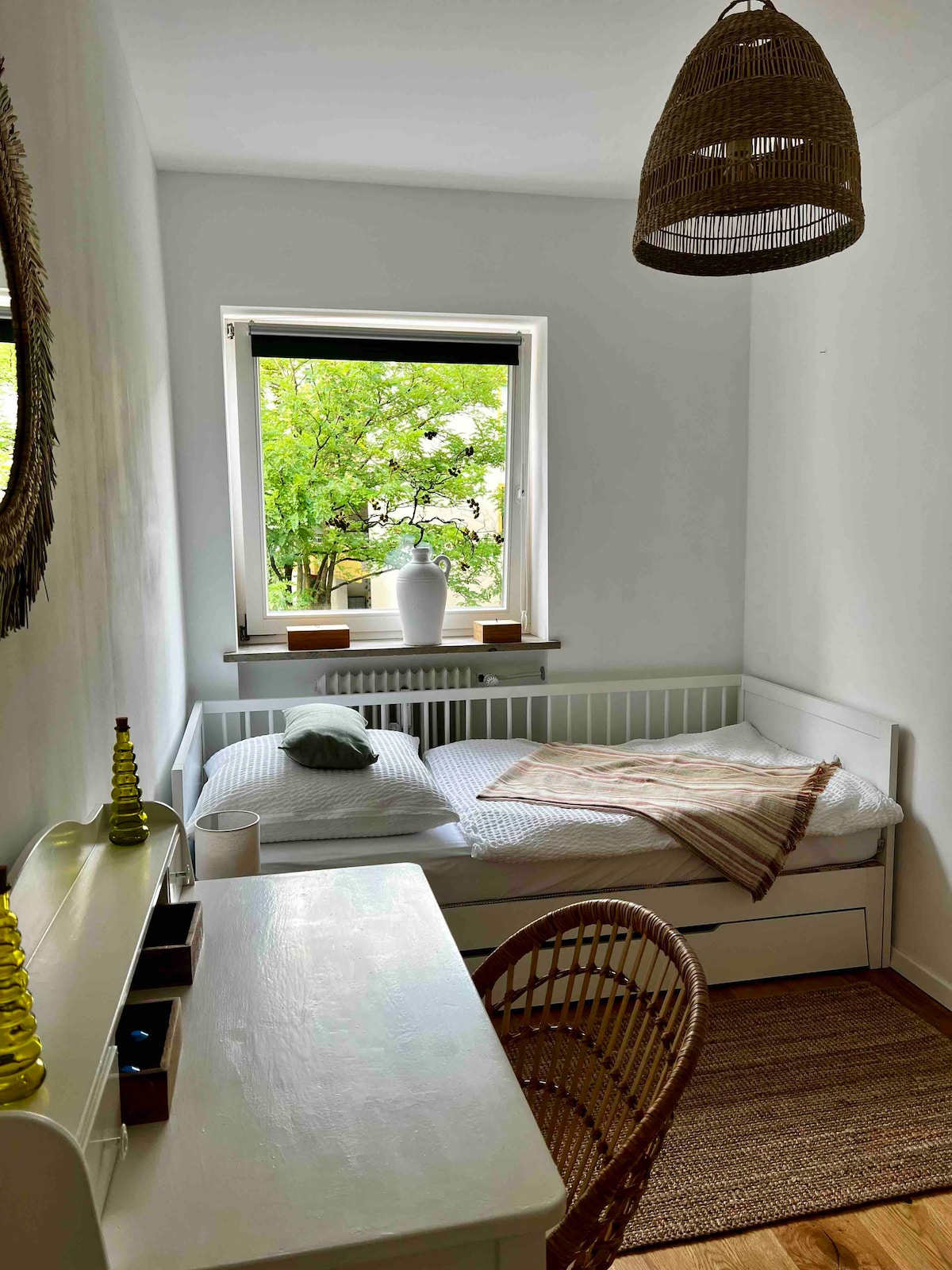 Tá an seomra 16 méadar cearnach ina bhfuil seomra folctha in Haidhausen, comharsanacht bhríomhar, chruthaitheach i lár München. Cúpla méadar ar shiúl tá ollmhargaí, beáir agus bialanna. Tá tú ar an mbunurlár le bealach isteach ar leith. Ar dhul isteach sa seomra duit feicfidh tú os do chomhair sa seomra folctha geal le cithfholcadán agus leithreas, agus cúinne ina bhfuil soithí, citeal agus cuisneoir. Níl aon chistin sa stiúideo. Ar thaobh na láimhe clé ansin tá síleálacha arda, urlár adhmaid ardchaighdeáin agus fuinneoga móra, chomh maith le deasc agus leaba cheart nua.