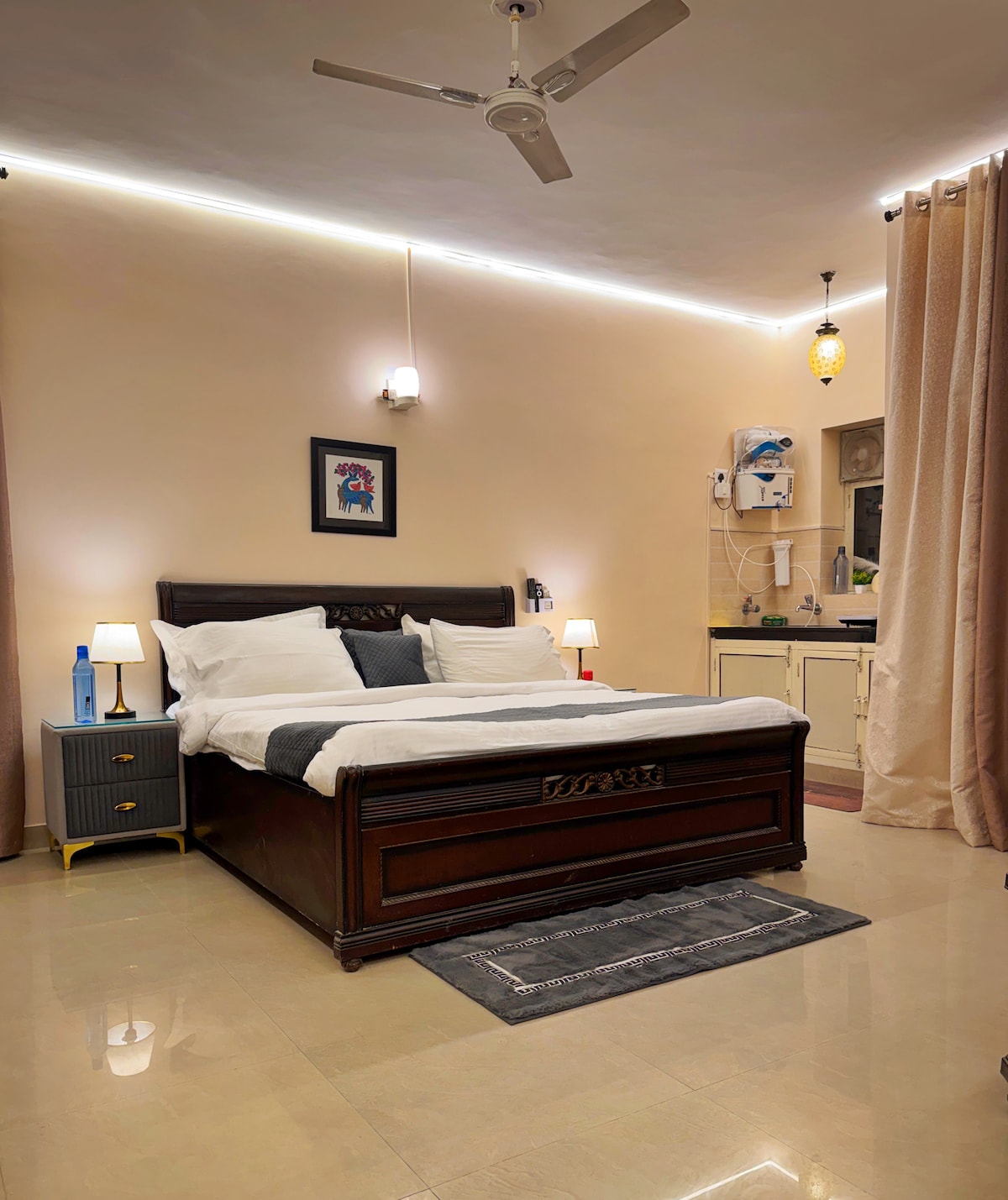 A spacious and inviting 1bhk home in a gated society. Explore nearby attractions- Keli Kunj marg (2 km) Prem mandir (2.9 km) Isckon (3.4 km) Bakey Bihari temple (5.3 km) Nidhivan (5.7 km) Enjoy the bright, clean and very quiet place for long and short stays with beautiful sunset view from a balcony. Self check-in facility for smooth stay. Our aim is to provide you with a comfortable & relaxing retreat during your stay. During winters heater on demand and chargeable basis