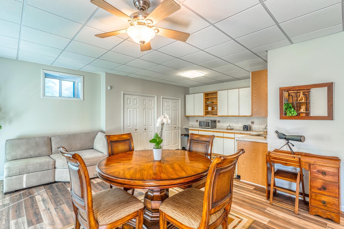 Coinnigh simplí é ag an saoire ghearr shuaimhneach seo atá suite go lárnach nuair a thagann tú chun blaiseadh a fháil de Chontae Calvert. Fan 30 nóiméad nó níos lú ó thránna, cadhcáil, 22 míle de chosáin fánaíochta, Páirc Jefferson - Patterson agus a féilte, fíonghoirt, Oileán Sholamón agus bialanna áitiúla Prince Frederick agus margaí feirmeoirí. Is árasán fairsing íoslaigh é ár bpillín nua - athchóirithe ina bhfuil na bunrudaí go léir a theastaíonn uait chun do scíth a ligean tar éis lá spraíúil ag iniúchadh an dúlra agus ár dtimpeallacht. Táimid ar bís le fáilte a chur romhat
