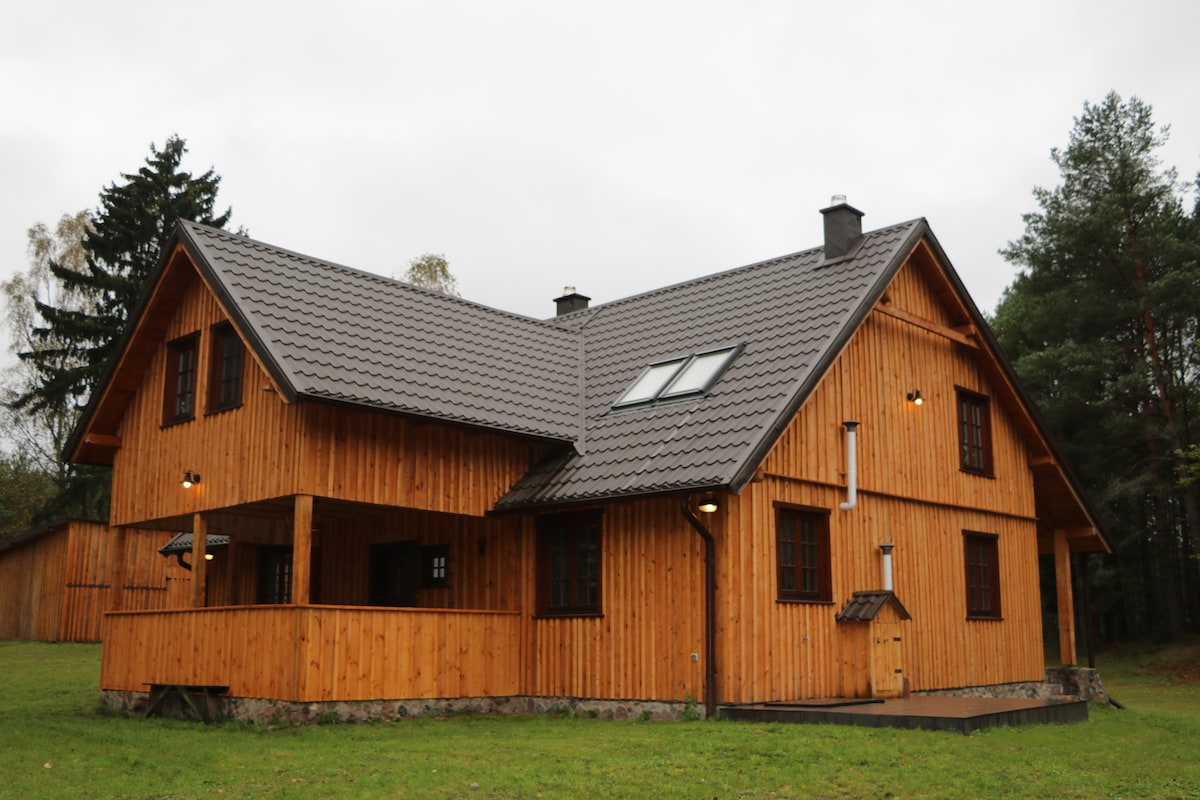 Cuirimid fáilte romhat chuig teachín bliana iomlán, atá suite faoi choill i gcroílár Kaszub. Is áit iontach é chun sos a ghlacadh ó bhrú agus ó bhuairt na cathrach agus do neart a athghiniúint. Tá an ceantar álainn oiriúnach do thurais siúil agus rothaíochta. Sa teach, cuirimid dhá sheomra leapa ar cíos ar an urlár uachtarach agus ar an mbunurlár tá cistin, seomra folctha, seomra itheacháin le teilifís agus teallach agus lochtán clúdaithe. Ón lochtán tá radharc ar na móinéir, ar an bhforaois agus ar an lochán.