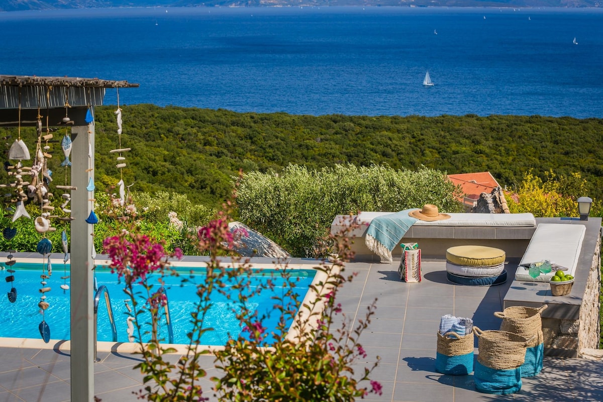 Éalaigh go Villa Helios, tearmann sómasach ina bhfuil radhairc iontacha ar an bhfarraige, foirfe do scíth a ligean agus do chuimhneacháin dhodhearmadta. 🏡 Tá trí sheomra leapa atá deartha go hálainn sa villa, a bhfuil a sheomra folctha ensuite féin ag gach ceann acu, a fhreastalaíonn go compordach ar suas le seisear aíonna agus príobháideacht agus áisiúlacht á gcinntiú ag an am céanna. 🌊 Téigh amach chuig linn snámha éigríche iontach, LE radhairc lánléargais ar an Muir Iónach atá soiléir ó thaobh criostail de agus ar Ithaka.