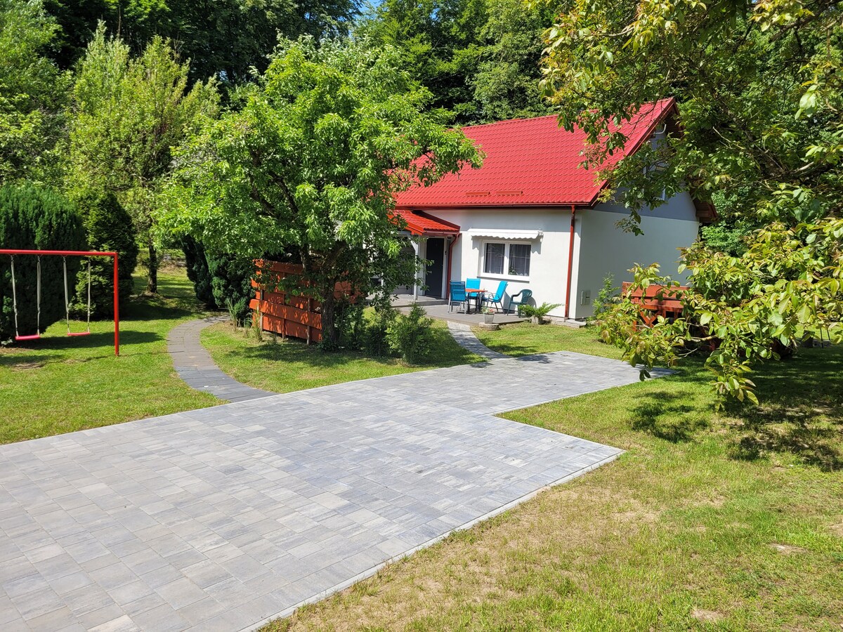 Teach saoire atmaisféarach i limistéar pearsanta, ina bhfuil rochtain ar Loch ar bhóthar príobháideach (roinnt dosaen méadar) * Suíomh foirfe: ar shiúl ó na hustle agus bustle agus turasóirí, * Is éard atá i gceist le trealamh breise saor in aisce an teachín ná cadhc, 2 rothar, * Foirfe do lánúineacha, do theaghlaigh a bhfuil leanaí nó grúpa cairde acu. In aice le: * Port luamh, trealamh uisce ar cíos, *Bialann, *Foraois, * Valley of Kashubian Palaces, * Linn snámha áineasa agus Oilimpeach, giomnáisiam, SPÁ, babhláil, * Rochtain éasca ar an bhfarraige