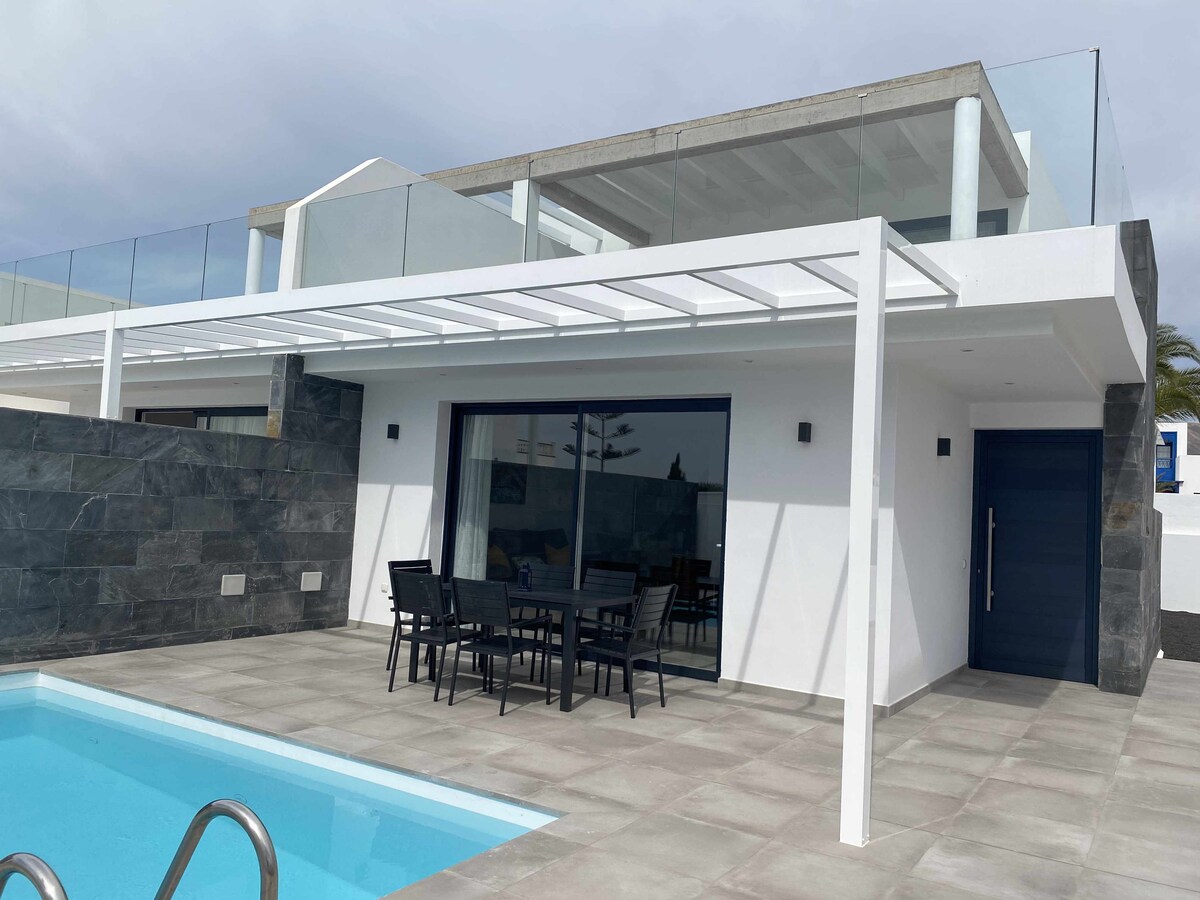 Tá an villa iontach seo a tógadh in 2023 suite ó dheas ó oileán Lanzarote, i gceantar faoi phribhléid Puerto Calero. Tá 3 sheomra leapa, 2 sheomra folctha agus Wi - Fi saor in aisce ann. Tá dhá ardán iontach ann le radharc ar an aigéan, chomh maith lena linn snámha agus beárbaiciú féin, oiriúnach do lánúineacha agus do theaghlaigh atá ag lorg suaimhneas agus compord.