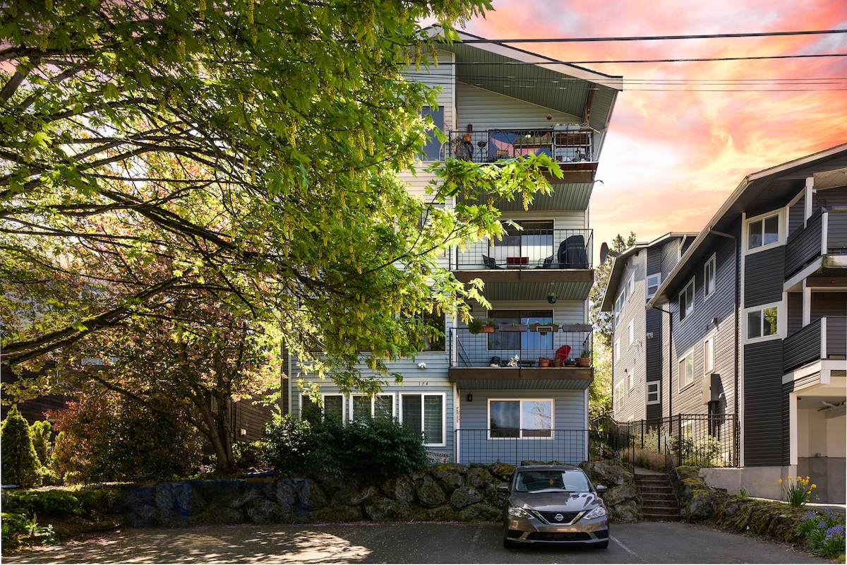 Bain sult as d'fhanacht ag an árasán 1 BR/1 BA seo i gcroílár Seattle. Tá 1 seomra leapa banríona, tolg codlata compordach, cistin iomlán, seomra folctha nuashonraithe, aonad W/D, WI - FI ardluais agus páirceáil gharáiste san árasán. Féach ar an aonráille ó do bhalcóin! Siúlóid 5 nóiméad chuig Space Needle, siúl 5 nóiméad go Chihuly & músaeim eile. Siúlóid 11 nóiméad go Amazon, imeall an uisce, Páirc Struchtúr Oilimpeach nó Airéine na hAeráide. Siúlóid 16 nóiméad go Plás Pike. Go leor bialanna, caiféanna, earraí grósaera agus siopaí in aice láimhe. Féinseiceáil isteach.