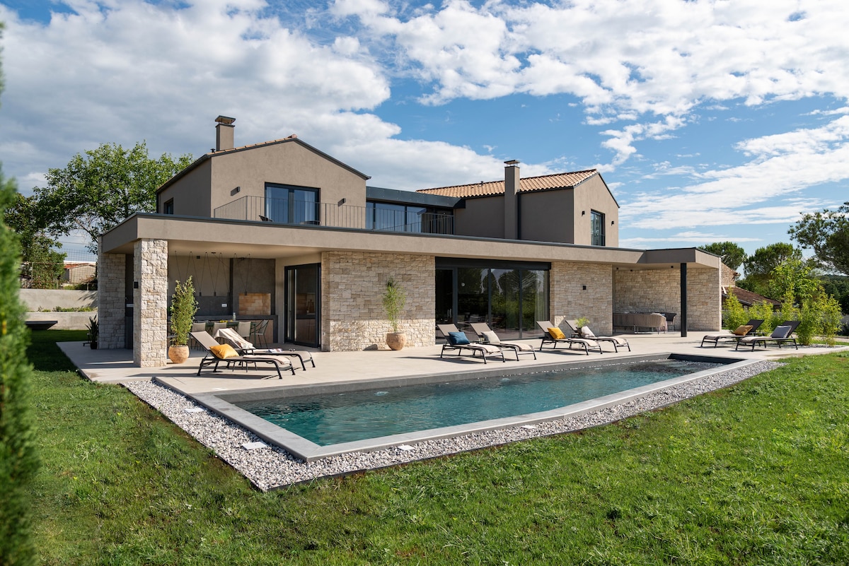 Villa galánta in aice le Rovinj le linn snámha atá fíoráille, tobán te, seomra allais. Múscail agus radhairc mhóra ar an ngleann lán de dhraíocht. Oiriúnach do lánúineacha agus do theaghlaigh, turas gairid go páirc eachtraíochta, Páirc Náisiúnta Brijuni, dinopark, bailte meánaoiseacha agus bia áitiúil. Is fíor - éalú glas é do dhuine ar bith atá ag iarraidh filleadh ar an dúlra le compord uile na maireachtála nua - aimseartha. Feistithe go hiomlán le haghaidh cócaireachta agus siamsaíochta i 2600 m2 de ghairdín (peil, liathróid luais, badmantan & spraoi linn snámha) do do pháistí agus do dhaoine muinteartha chun taitneamh a bhaint as.