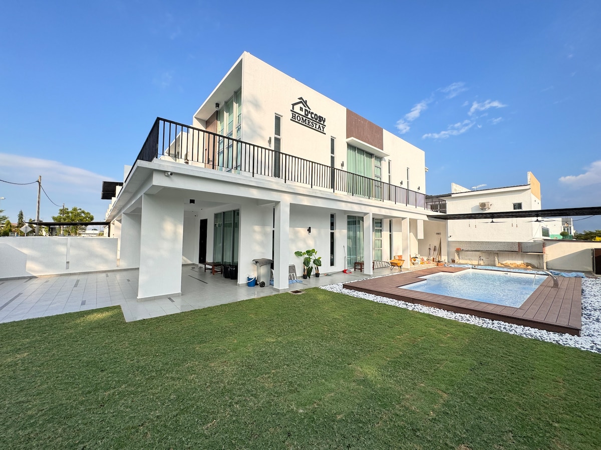 1) 1.2m x 10ft x 26ft linnte snámha le 2 sleamhnán 2) Is féidir le híosmhéid páirceáil 5 gluaisteáin limistéar 3) 7 Leaba Queens 2 Leaba Super Aonair & 2 Leaba shingil 4) 4 seomra folctha príobháideach & 2 seomra folctha coiteann 5) Wi - Fi saor in aisce 6) 2 aonad de dáileoir uisce óil te/fuar 7) 5min tiomáint go Bukit Indah AEON ionad siopadóireachta le Pictiúrlann 8) 10min tiomáint go Legoland An Mhalaeisia 9) tiomáint 20min go Johor Préimh Asraon 10) 25min tiomáint chuig Aerfort Senai