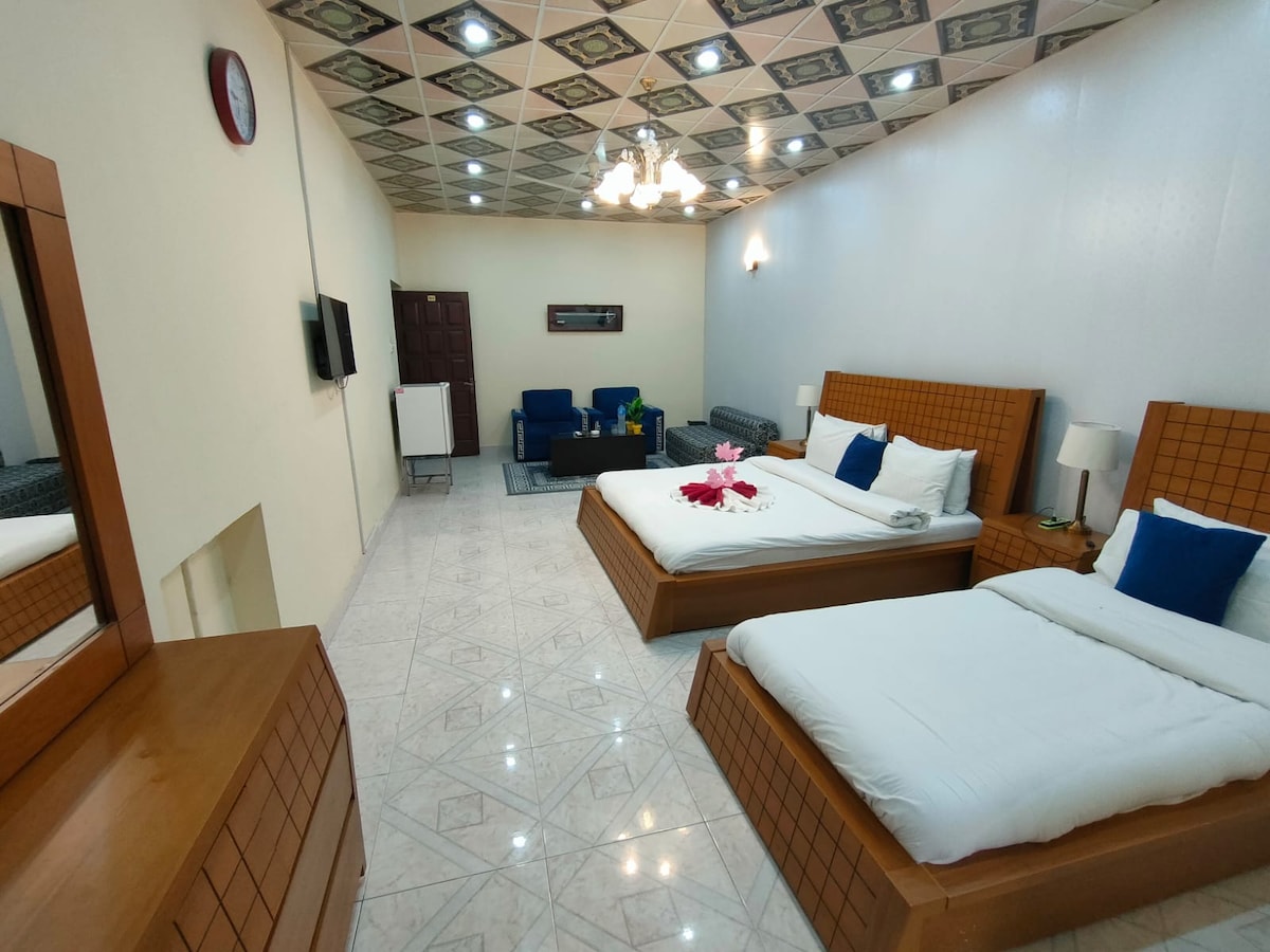 ID Card/Passport will be required after booking through airbnb and may be taken for security purposes through your stay. -Wi-Fi -A.C/Heating -Attached bathroom with hot water -Shared kitchen and lounge. -Full king-sized bed, mini-fridge, and cupboards. -Smart TV. Mattresses are charged separately for 500pkr each (3 mattresses are free) No Smoking in listing premises Only married couples allowed due to pakistani local laws(documentation required) visitors allowed with permission only