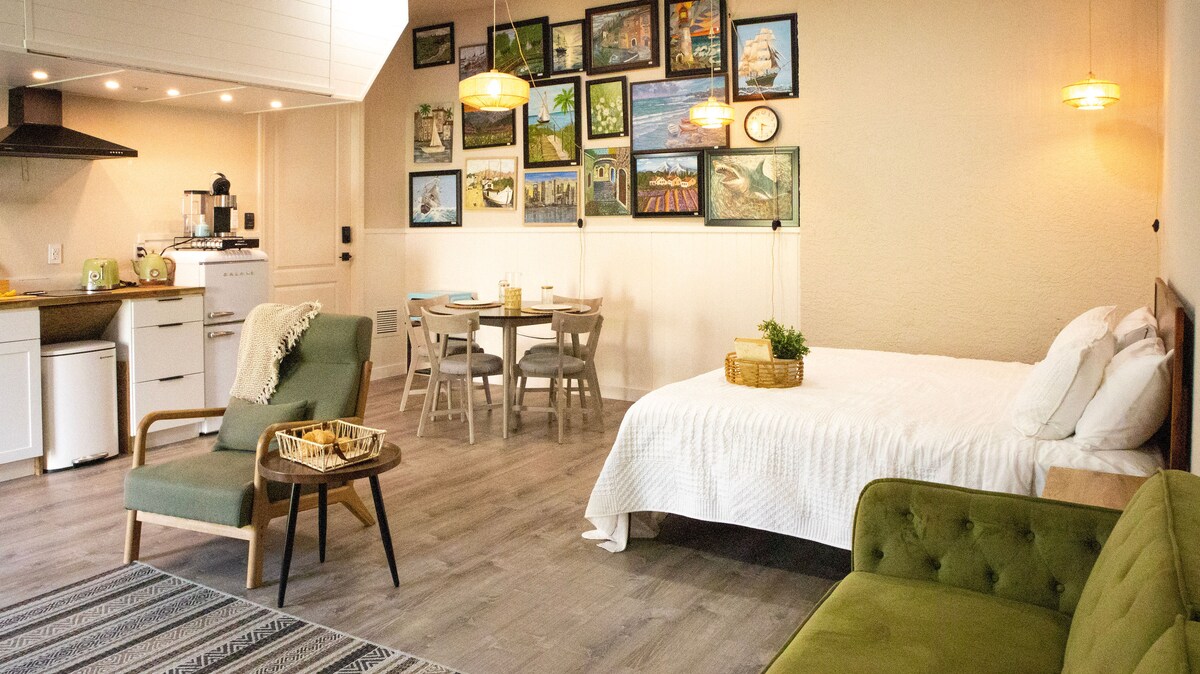 Fáilte chuig Do Shaoire Mhaireachtála Luxe! Faigh blaiseadh den mheascán foirfe de chompord agus sofaisticiúlacht sa Suite Rí Feidhmiúcháin seo le Radhairc na Cathrach, atá suite i gcroílár Downtown Fort Myers. Tá leaba rí phluis agus tolg tarraingthe amach ar mhéid banríona san árasán nua - aimseartha 1 sheomra leapa seo, atá oiriúnach do lánúineacha, do ghairmithe, nó do theaghlaigh bheaga. Bain sult as radhairc na cathrach, cistin atá feistithe go hiomlán, agus rochtain ar shaoráidí den scoth díreach céimeanna ón mbia, ón tsiopadóireacht agus ón tsiamsaíocht is fearr in Fort Myers.