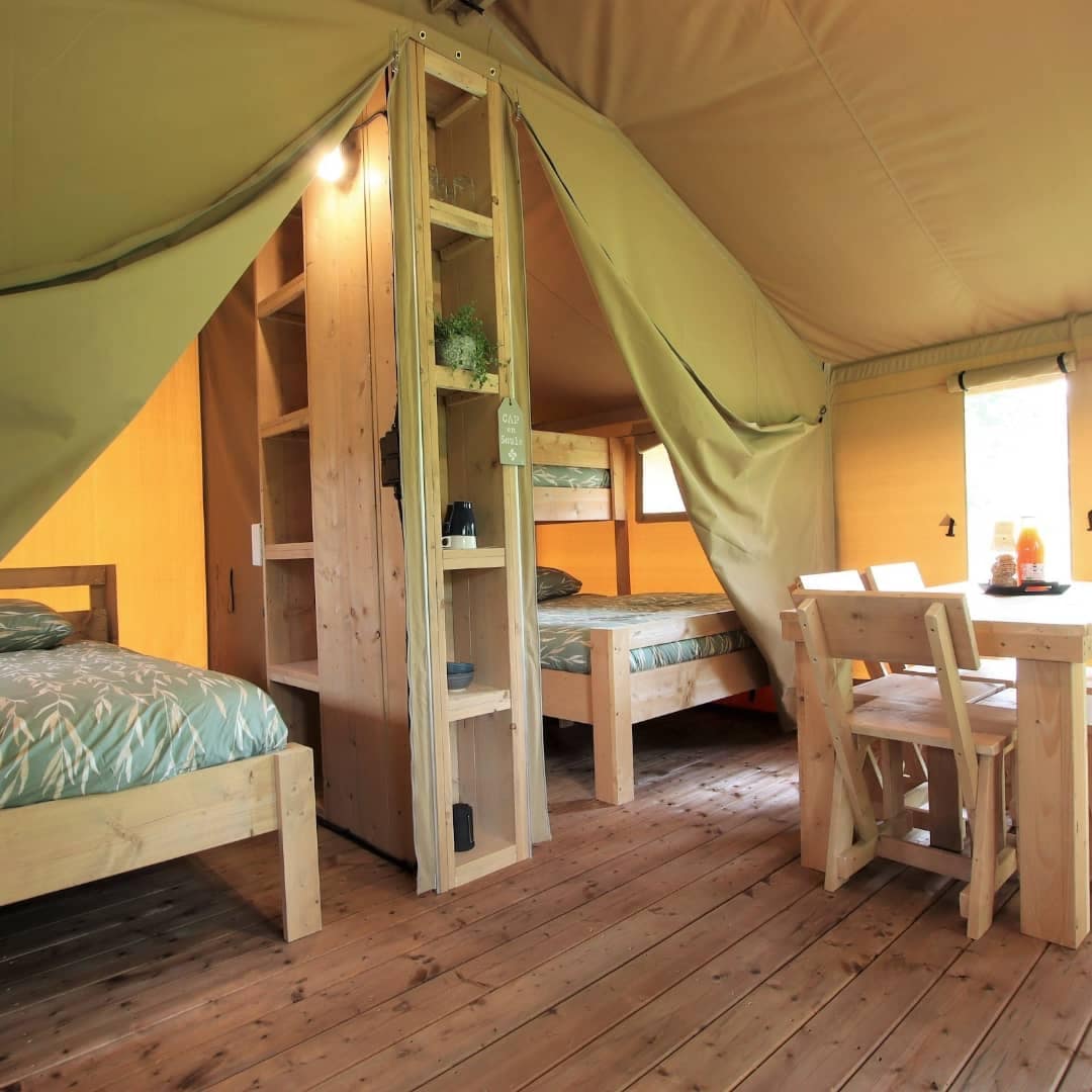 Each tent has its own place with beautiful views. Go camping with the luxury of an apartment; two bedrooms with real beds with good mattresses, a room in the middle with a kitchen on wheels so you can cook outside and a seating area. On the covered terrace you will find a table with chairs and 2 lounge chairs.