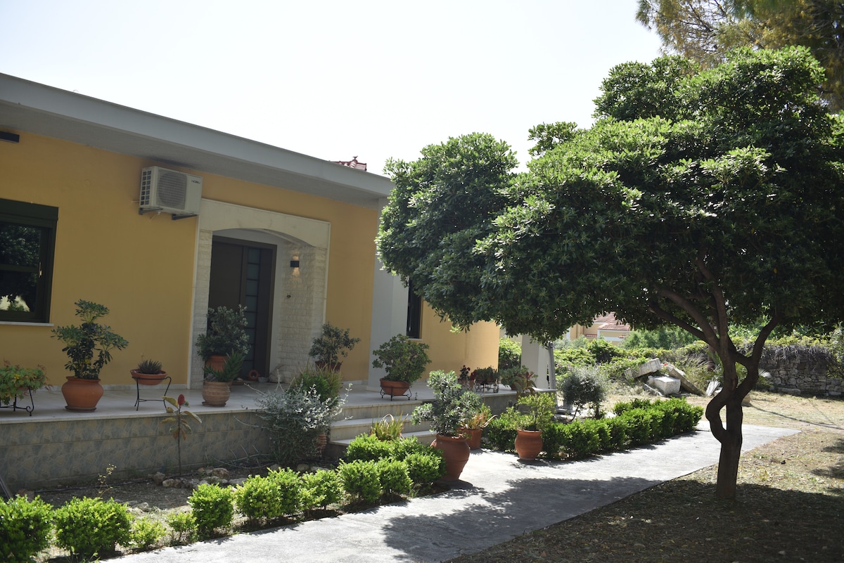 Is seanteach traidisiúnta samian athchóirithe é an teach atá suite i gcomharsanacht chiúin litriúil i lár Pythiterranio díreach in aice le caisleán agus séipéal ón 18ú haois. Níl an calafort ach 50 méadar ar shiúl ón áit ar féidir bialanna, caifitéire agus beáir a fháil ar fud an domhain. Níl Aerfort Bhaile Átha Cliath ach 2 Km ar shiúl. Tá tránna iontacha inrochtana faoi fhad siúil. Tá an teach oiriúnach do theaghlaigh, do lánúineacha chomh maith le daoine ar mian leo laethanta saoire agus obair a bheith acu san am céanna. Bíonn iompar poiblí rialta go laethúil.