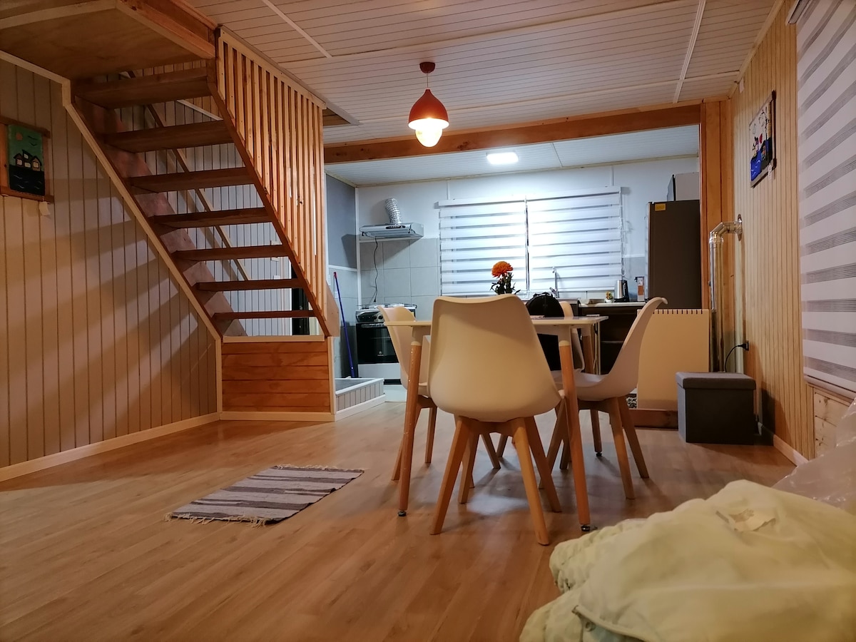An bháisteach lasmuigh, an fharraige díreach 10 gcéim ar shiúl, na sunsets is áille de Chiloé, agus an radharc draíochtúil sin i ngach uile fhuinneog den teach beag teolaí seo, adhmad ar fad, téite i gcónaí le tine an sorn. Adhmad san áireamh! Cúpla méadar ón duga stairiúil agus sa lár, gar do na siopaí, na bialanna agus an críochfort bus. Praghas promóisin le haghaidh tréimhsí fanachta seachtaine nó níos mó. Tar agus bí i do chónaí in Queilen, áit a labhraíonn an talamh leis an bhfarraige.