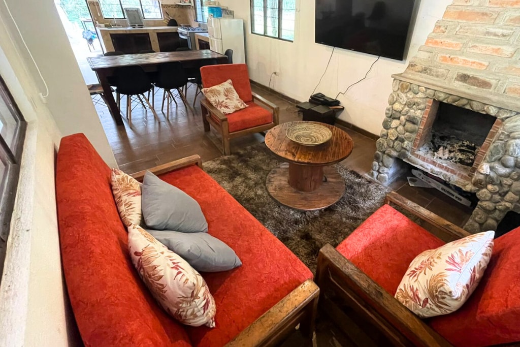 Bain sult as fanacht síochánta ag ár dteach tuaithe, atá suite laistigh d'aclann phríobháideach dúlra. Foirfe do theaghlaigh nó do ghrúpaí cairde, cuireann an áit siúlóidí ar fáil trí easanna agus conairí foraoise, faire ar éin, agus teagmhálacha le halpacaí agus capaill. Tráthnóna, is féidir leat beárbaiciú a bheith agat agus teacht le chéile timpeall an phoill thine. Tá bialann againn freisin ina bhfuil radharc iontach ar an abhainn, áit ar féidir leat taitneamh a bhaint as bricfeasta, lón nó dinnéar blasta. Saoire ghearr fhoirfe díreach 1 uair an chloig ó Quito!
