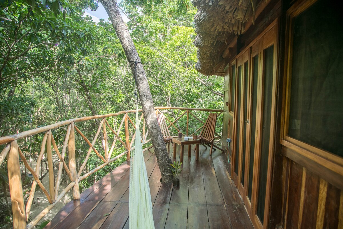 No availability? Other treehouses on Host Profile. Enjoy this unique Jungle Treehouse Experience in the tree tops. The Canopy treehouse is intentionally elevated (height: 6 Mts/20ft) and shaped amongst the trees. A spacious Eco dome gives you all the comfort of Glamping: King bed, private bathroom & HIGH SPEED fan. Relax in nature, swing the hammock enjoying the views or gaze at the stars. The property is located 10-15 MIN DRIVE from different beaches of Tulum & a short stroll to nearby cenotes!