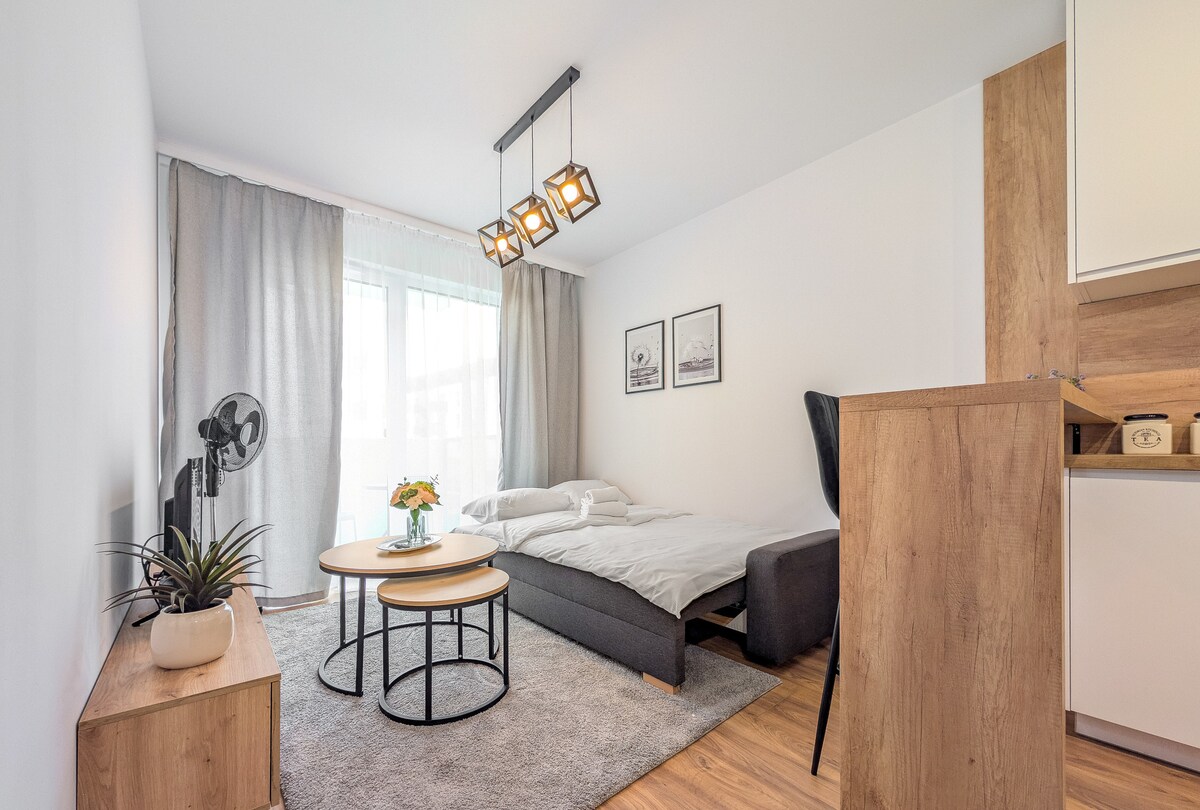 Árasán nua - aimseartha agus sómasach, maisithe le haird ar mhionsonraí. Is éard atá ann seomra suí ina bhfuil cistinéad, seomra leapa, seomra folctha agus balcóin mhór. Árasán atá suite i lár na cathrach ar an Odra féin. Cuireann nochtadh d'fhuinneoga ar Arsenal na Cathrach agus páirc iontach seanfhaiseanta suaimhneas ar fáil d'aíonna. Cearnóg an Mhargaidh - 600m Boulevard Xawerego Dunikowski - 850m Promanáid an tSeanbhaile - 850m Oileán Słodowa - 900m Fóram Náisiúnta an Cheoil - 1km Ostrów Tumski - 2.5km