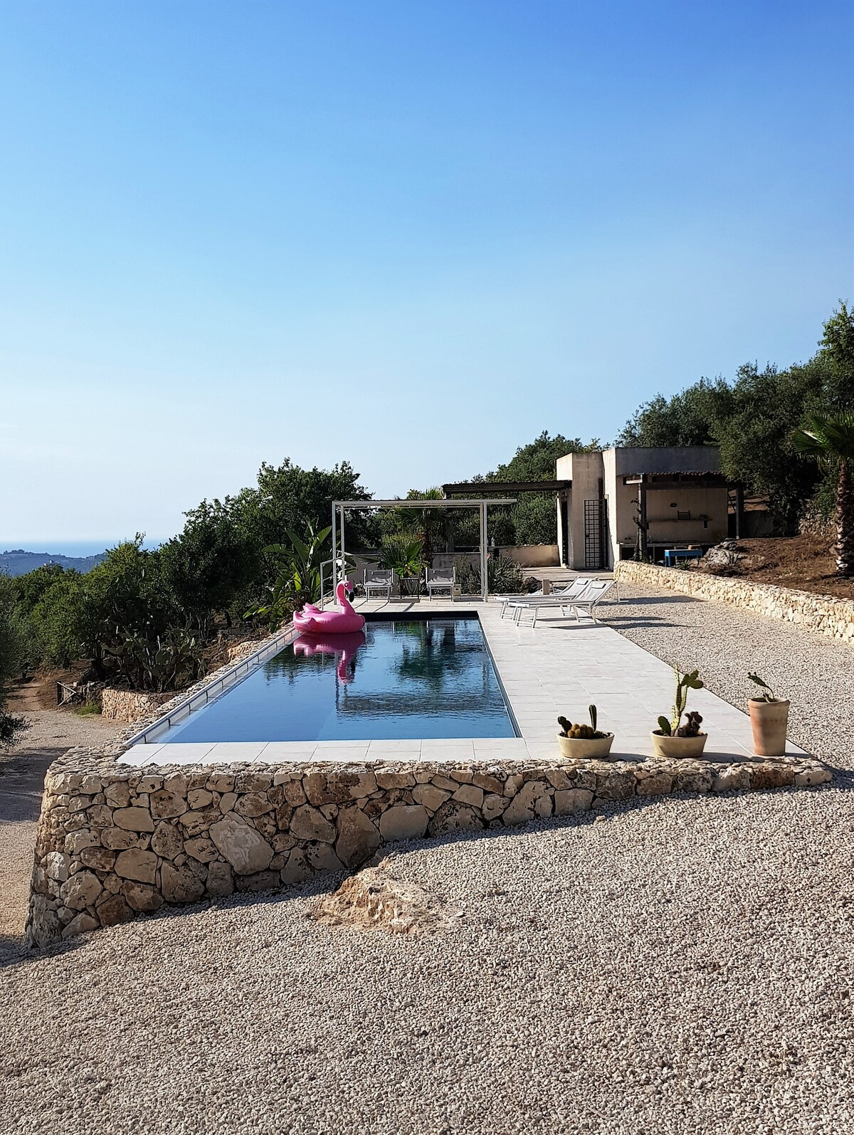 Mionárasán timpeallaithe ag an ngaineamhlach agus ar fionraí i suíomh lánléargais idir an fharraige agus loch na bhfanlamingos. Tá an teach go hiomlán uathrialach agus tá cistin, seomra folctha, áit itheacháin agus mion - linn snámha ann chun sásamh a bhaint as na seiteanna gréine thar an Meánmhuir. Tá aíonna ar fáil d'aíonna sa villa in aice láimhe: tolglann mhór, cistin lasmuigh do bheárbaiciúnna, gairdín. Unequipped tránna 300m ar shiúl, tránna feistithe Carratois agus Isola delle Correnti 5 nóim tiomáint. Pachino agus Portopalo 10 nóiméad ar shiúl, Marzamemi 15