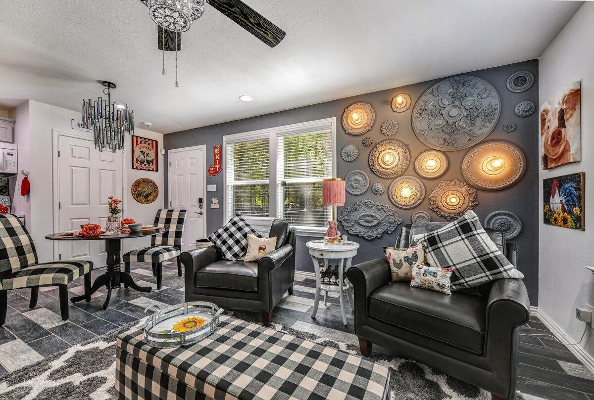 Cad a d'fhéadfadh a bheith níos fearr ná do laethanta saoire a chaitheamh @ First Monday Trade Days nó díreach dul ar saoire? Is teachín teolaí nuathógtha é The Tiny Bluebird atá maisithe go blasta agus atá suite ar Willow Lake in Wills Point, Texas. Caith cloch amach ón iascaireacht, ón snámh, nó ón gcadhcáil. Tá urláir tílithe adhmaid chrua - thuathúla ildaite ar fud an teachín seo a bhfuil soilsiú álainn ag baint leo. Tá urláir tílithe, barr doirteal marmair bháin, agus cithfholcadán tílithe siúil isteach sa phríomhfholcadán.