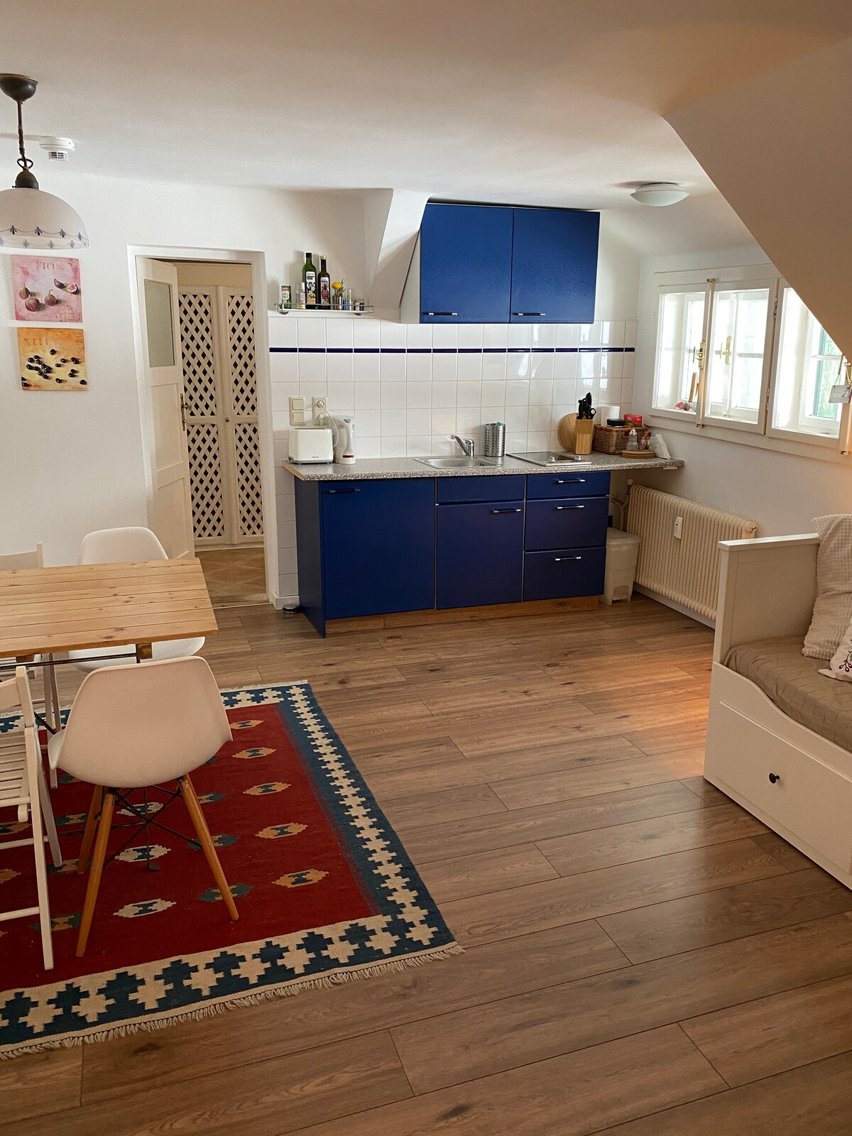 Lochta sa stiúideo Tá an lochta galánta cluthar seo i stiúideo Etienne suite ar imeall na foraoise díreach lasmuigh de Bad Ischl i réigiún Salzkammergut. Faigheann daoine a bhfuil dúil mhór acu san ealaín agus sa dúlra luach a gcuid airgid anseo. Déan teagmháil leis an ealaíontóir Etienne, a phéinteálann ar an gcéad urlár den stiúideo. Tá an radharc ar an tírdhreach álainn sléibhtiúil meabhlach. Ón ardán ar an taobh thoir, is féidir leat taitneamh a bhaint as grian na maidine ag am bricfeasta agus radharc iontach a bheith agat ar an ngairdín ina bhfuil lochán agus áit don bheárbaiciú.