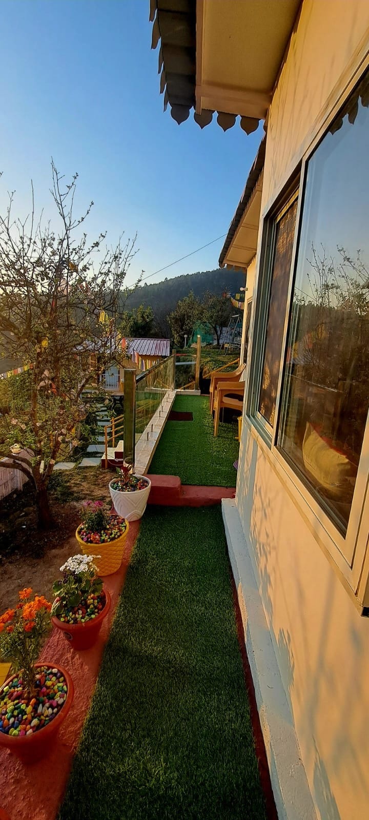 Agus tú suite i sráidbhaile síochánta de chuid na Himiléithe, is é an teachín gleoite seo do shuaimhneas, an dúlra. Beidh ort siúl 10 -15 nóiméad chun an áit a bhaint amach. Mar shíneadh ar ár bhfanacht grámhar Dhyanasadan, cuireann an tearmann sráidbhaile seo eispéireas uathúil ar fáil inar féidir leat moilliú agus athcheangal a dhéanamh leis an dúlra. Déan suas le ceol na n - éan, bain sult as radhairc sléibhe, agus siúil trí chosáin áille. Meascann ár dteachín atá deartha go cúramach draíocht thuathúil le compord teolaí, atá oiriúnach do thaistealaithe aonair, do lánúineacha nó do theaghlach