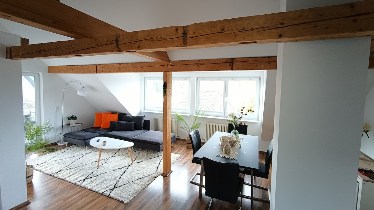 Penthouse nua - aimseartha i gcroílár an tseanbhaile. Athchóirithe as an nua agus fuaimdhíonta sa seanfhoirgneamh le hardaitheoir. Leaba earraigh bosca King - size, leaba thoilg 160 cm le barrán, teilifíseán cliste & cistin lánfheistithe. Foirfe do suas le 4 dhuine fásta, tá an t - árasán suite i lár absalóideach Ravensburg - tá radhairc, bialanna agus siopaí faoi fhad siúil. Níl Ravensburger Spieleland ach 15 nóiméad ar shiúl sa charr. Tá roinnt garáistí páirceála sa gharchomharsanacht.