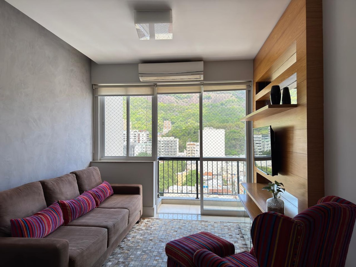 (Árasán iomlán!) Tá ár spás ciúin compordach réidh duit! Beidh cistin agat ina bhfuil meaisín níocháin agus miasniteoir, seomra suí grianmhar ina bhfuil deic agus spá, seomra leapa príobháideach ina bhfuil fuinneoga fuaimdhíonacha, leaba bhanríona, leathanbhanda snáithín, WI - FI, agus seomra folctha suite ina bhfuil folcadán agus cithfholcadán. Tá Botafogo thar a bheith insiúlta, agus tá go leor iompair phoiblí in aice láimhe. Táimid siúlóid 2 nóiméad ón bhfobhealach! Bí ar do shuaimhneas, lig do scíth agus bain sult as! Tá súil againn go mbainfidh tú taitneamh as d'fhanacht linn!