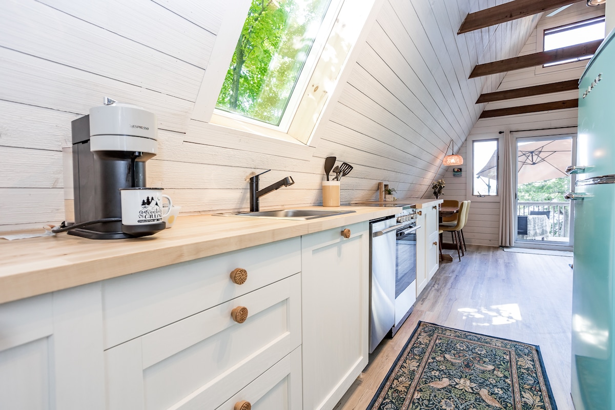 Fáilte chuig Cábán Hideaway, áit ar féidir leat scíth a ligean i nglacadh leis an dúlra. Anseo, is féidir leat do cheanáin a chur ar an ngríoscán, dul i do luí i gcathaoireacha Adirondack ar an mbalcóin, nó do scíth a ligean laistigh. Tar tráthnóna, bailigh le chéile cois tine ar an bpóirse chun féachaint ar na fireflies ag damhsa nó lig do scíth sa tobán te ar an bpóirse cúil. Is é an meascán idéalach é de shuaimhneas nádúrtha agus de chompord baileach. Sa gheimhreadh, cluthar suas ag an woodstove sa seomra suí agus teacht suas ar na seónna teilifíse is fearr leat.