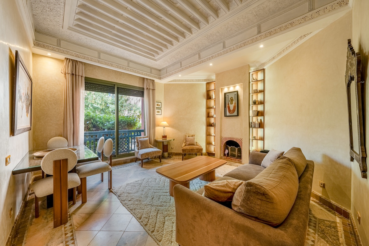 Fáilte go dtí ár n - árasán a athchóiríodh le déanaí, i gcroílár garrán pailme Marrakech, i nGairdíní Palmeraie Village 2. Díreach 10 nóiméad ó lár na cathrach, comhchuibhíonn ár lóistín compord nua - aimseartha agus draíocht thraidisiúnta, foirfe do chuimhneacháin shéimh le cairde nó le do theaghlach. Bain sult as dhá linn snámha, cúirteanna leadóige, agus club gailf cúpla nóiméad ar shiúl, chomh maith le seirbhís slándála 24 uair an chloig.