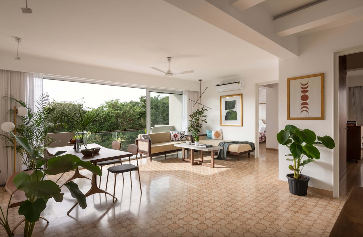 A hidden gem tucked away in Panjim's poshest zip code. Our 2BHK penthouse has a private terrace and is a short walk from Miramar beach. A Goan sanctuary surrounded by greenery; the open-plan, sprawling living room transforms into a chic space after sunset with designer ambient lighting. The famous promenade, grocery stores, and cafes are just a stroll away. Fontainhas & casinos are a short drive away. Enjoy high-speed WiFi if you’re working from home. PS: Look for peacocks in the morning!