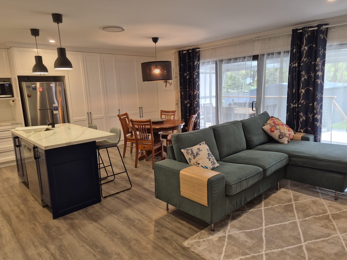 Cosy suas sa teach aíochta comhaimseartha seo, ar leibhéal scoilte, atá deartha le mothú sleek Australiana. Stiúideo iar - ealaíontóra, tá síleálacha as cuimse agus flúirse solais nádúrtha sa spás. Is é an rud is fearr ar fad ná an suíomh - níl ach siúlóid 5 nóiméad go dtí lár bhaile Mittagong, áit a bhfuil caiféanna agus bialanna iontacha ag fanacht leat. Chomh maith leis sin laistigh de shiúlóid éasca tá Mount Gibraltar agus Loch Alexandra lena rianta iontacha coilleála, agus gan ach 5 nóiméad ag tiomáint isteach go Bowral.