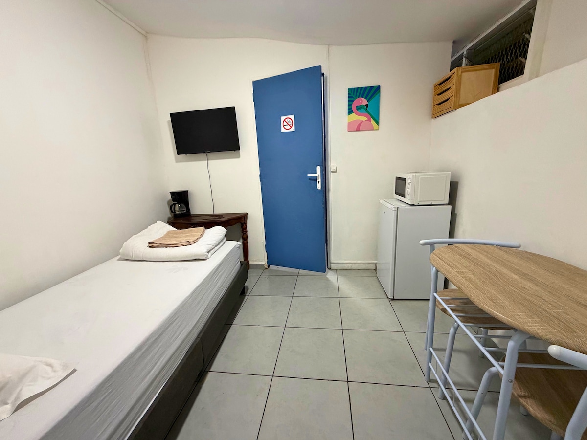 Stay comfortably in central Saint-Denis! ✨ A private and fully equipped single room with A/C, fast Wi-Fi and independent access. Ideal for solo travelers, professionals, or short city stays. Free public parking is available near the hotel. ✔️ 1 single bed ✔️ A/C & high-speed Wi-Fi ✔️ Private bathroom ✔️ Fridge, microwave & kettle ✔️ Smart HD TV ✔️ Early check-in possible — message us ✔️ Excellent central location, close to shops & transport