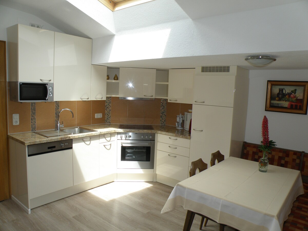 Árasán fairsing 90 m² in Nassereith, Tyrol, foirfe do theaghlaigh nó do ghrúpaí de suas le 4 dhuine (oiriúnach fiú do suas le 6 dhuine agus an tolg mór sa seomra suí á úsáid). Tá cistin lánfheistithe, seomra suí mór ina bhfuil tolg, balcóin ghrianmhar, seomra folctha ina bhfuil cithfholcadán agus folcadh, meaisín níocháin, Wi-Fi tapa agus meaisín reatha ar fáil. Foirfe le haghaidh scíthe, cócaireachta, tráthnóna le chéile nó fánaíochta nó sciála sna sléibhte. Agus sea, tá na sléibhte ag fanacht leat!