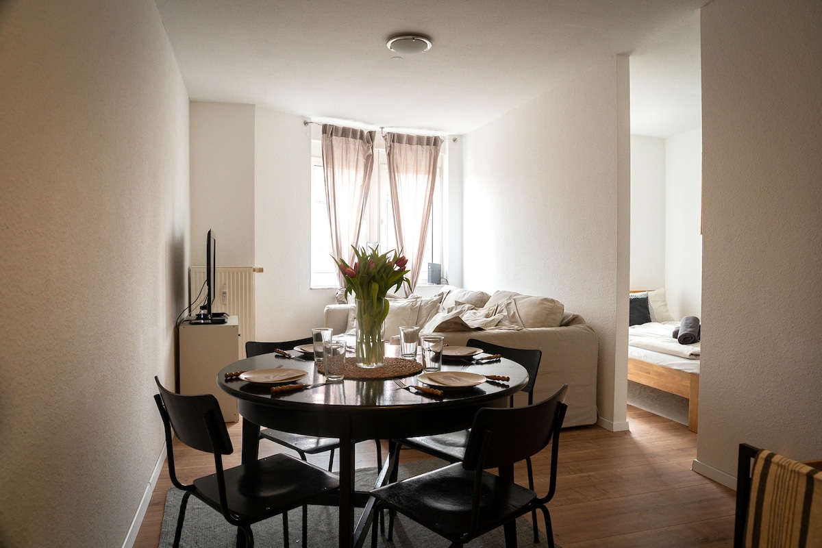 Árasán teolaí íoslaigh aon seomra, ina bhfuil micreathonnán, leaba, leaba bhreise, cábán cithfholcadáin agus leithreas ar leith ar féidir glas a chur air. Tá vardrús beag chomh maith le teilifíseán agus Wi - Fi ar fáil, soláthraíonn solas síleála comhtháite dóthain solais. Sa tsráid os comhair an tí gheobhaidh tú spás páirceála i gcónaí. Tá an stad bus is gaire 3 nóiméad ón Schwetzinger Banhof thart ar 10 nóiméad ar shiúl. Margadh siopadóireachta glan 5 nóiméad ar shiúl na gcos.