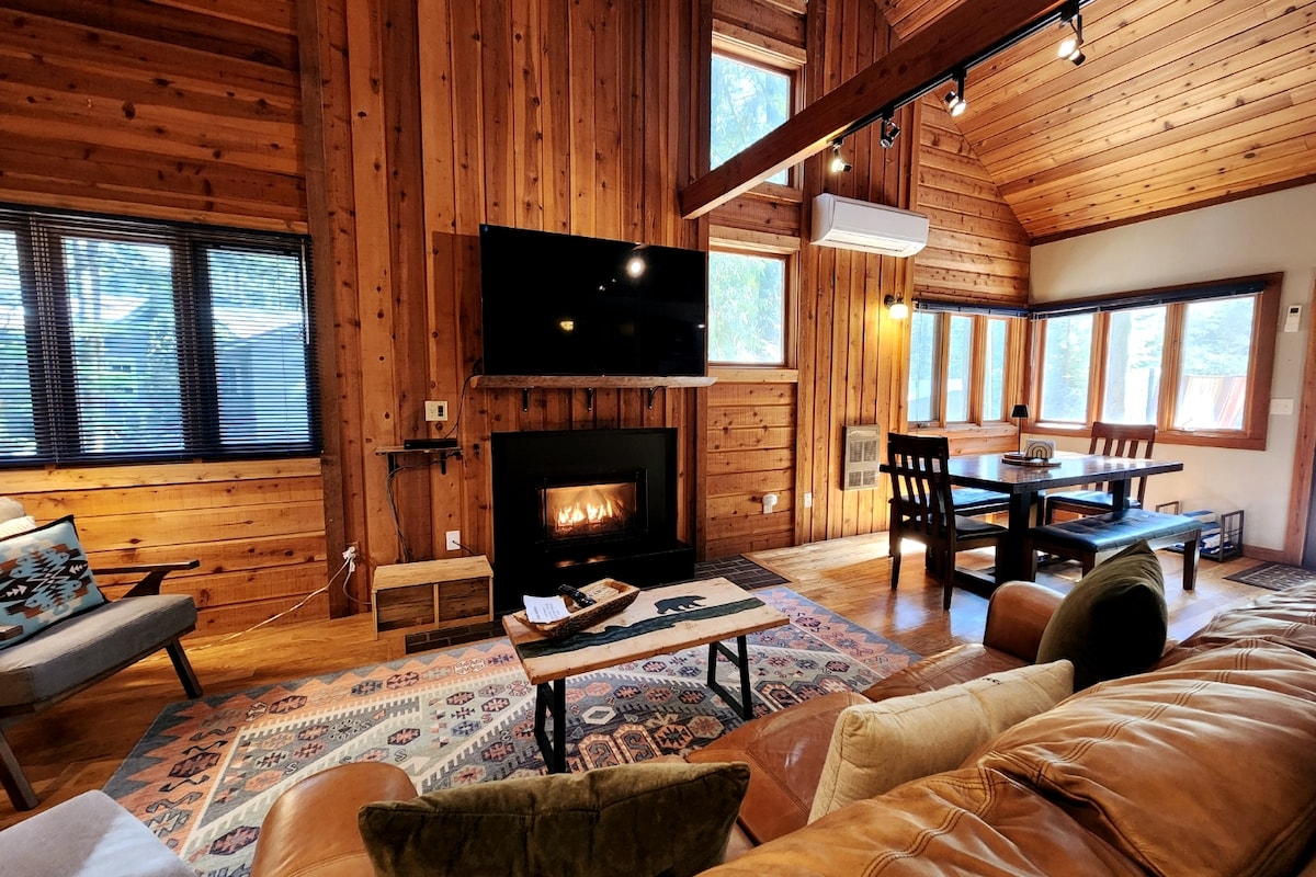 Cábán beag cluthar sa choill. Siúlóid ghearr go dtí abhainn Zig Zag. Dea - fheistithe chun tú a chur ar do chompord & rud beag millte. Is féidir taitneamh a bhaint as an taobh amuigh am ar bith den bhliain mar gheall ar an bpóirse iontach atá clúdaithe ar chúl! Beidh áiteanna codlata AN - chluthar, teoranta, áiteanna codlata príobháideacha teoranta. Leaba bhanríona sa seomra leapa thuas staighre, leaba Q thíos staighre i cubby leaba oscailte, agus tolg Q sleeper.