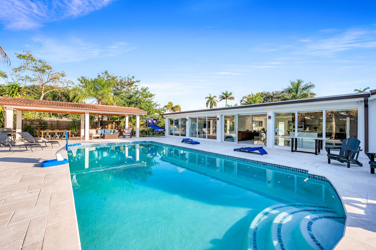 Fully remodeled luxury home in a top area surrounded by mansions, minutes from The Falls Mall, Lifetime Fitness, Fresh Market & Publix. This modern retreat features open living spaces with high-end finishes, a gourmet kitchen, and custom details. Enjoy over 16,000 sq ft of private backyard with resort-style pool, racket sports court, BBQ, gym, ping pong and landscaped gardens—perfect for families or groups seeking elegance, recreation, and convenience. Fully equipped for families with babies