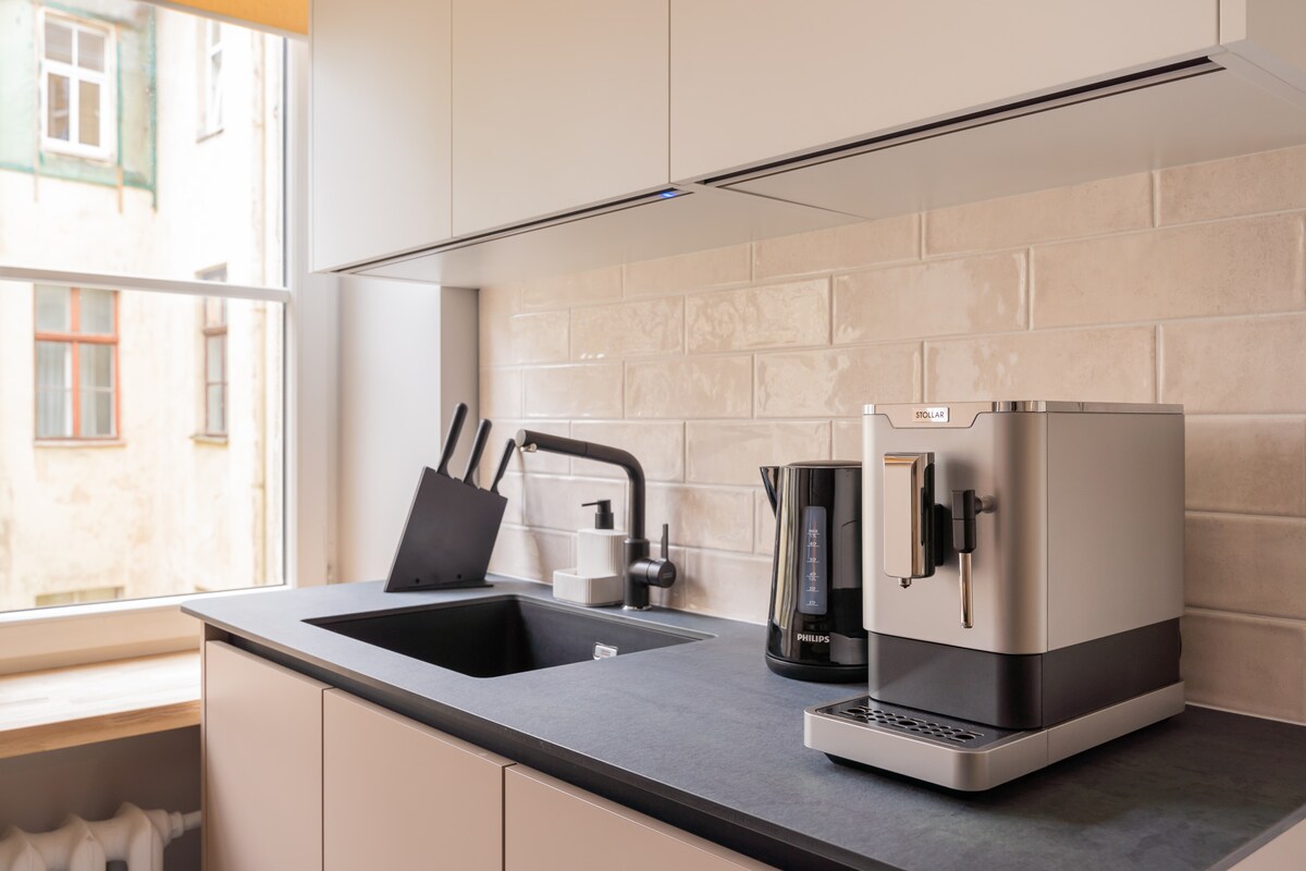 Árasán galánta, nuathógtha ina bhfuil bealach isteach príobháideach, sauna suaimhneach, agus cófraí móra ionsuite - foirfe le haghaidh tréimhsí fanachta gearra nó fada. Lonnaithe i gceantar bríomhar gar do na siamsaíocht oíche, beáir, caiféanna agus áiteanna cultúrtha is fearr in Riga. Rochtain den scoth ar gach rogha iompair phoiblí, rud a fhágann go bhfuil sé éasca iniúchadh a dhéanamh ar an gcathair. Foirfe do lánúineacha, do thaistealaithe aonair, do ghrúpaí cairde nó d'aon duine atá ag lorg compoird agus áise i gcroílár Ríge. Le WI-FI ardluais agus luchtaire feithiclí leictreacha trasna na sráide.