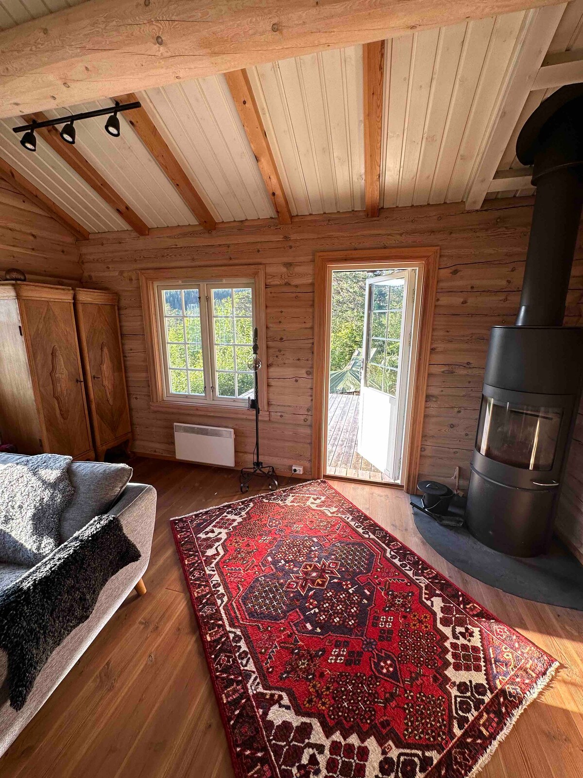 Cábán iontach le radhairc lánléargais ar Vikerfjell.
