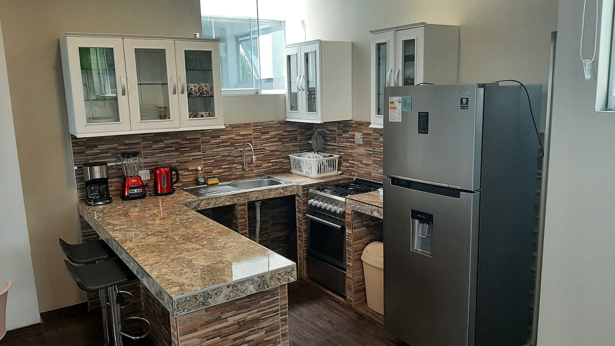 Lig do scíth sa spás iontach ciúin galánta seo. Le rochtain réasúnta ar phríomhshráideanna i lár na cathrach, áit a bhfaighidh tú iompar poiblí nó príobháideach go héasca. Tá an depa suite gar don Ospidéal Réigiúnach; trí nóiméad ó Chearnóg Punchana, bialanna agus an droichead nanay, cúig nóiméad ó lár na cathrach agus 10 nóiméad ón Mall Aventura . Lonnaithe ar an gcéad urlár, árasán úrnua, chun go mbeidh d'fhanacht ar do shuaimhneas.