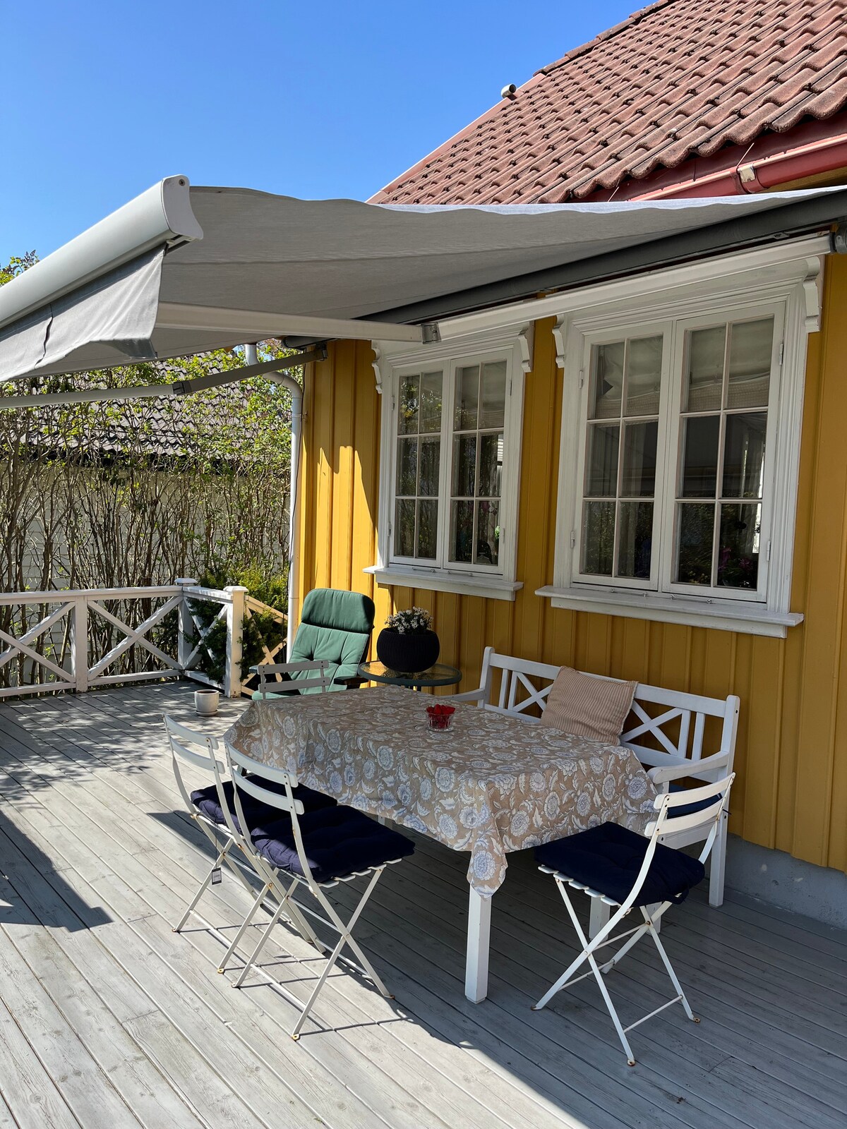 Her bor du ca 1 km fra bysentrum, ca 250 m fra matbutikken, ca 1 km fra Randvik stranda med svaberg, fiskemuligheter og badestrand. Boligen har 2 soverom med dobbeltsenger og 1 barnerom med sprinkelseng og mulighet for å sette opp en ekstra reiseseng. Huset passer derfor til maksimalt 4 voksne og 2 små barn. Du får morgensolen på verandaen på fremsiden av huset og ettermiddags/kveldssol på verandaen på baksiden av huset. Gassgrill på verandaen. Godt med parkeringsplass og el-billader i garasjen.