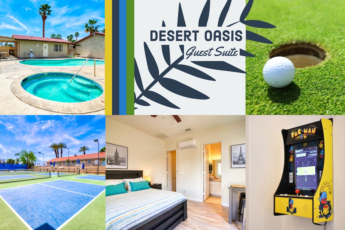 Stiúideo Cluthar le bealach isteach príobháideach & paitió, linn snámha & Spa, galf timpeall, 8min - Tennis Gardens, 12min - Acrisure, win win location! I gcroílár na cathrach, ach i gcomharsanacht chiúin ina bhfuil go leor páirceála sráide. Siúlóid 10 nóiméad: Albertson's, TraderJoe's, stáisiún gáis, tirimghlantóirí, salóin gruaige & ingne & beagán bialanna. Tiomántán tapa: Siopaí, dánlanna ealaíne, bialanna & beáir ar El Paseo, Acresure Arena, McCollum Theater, Tennis Gardens, Golf, Chella, Stagecoach, Living Desert Zoo, Casino