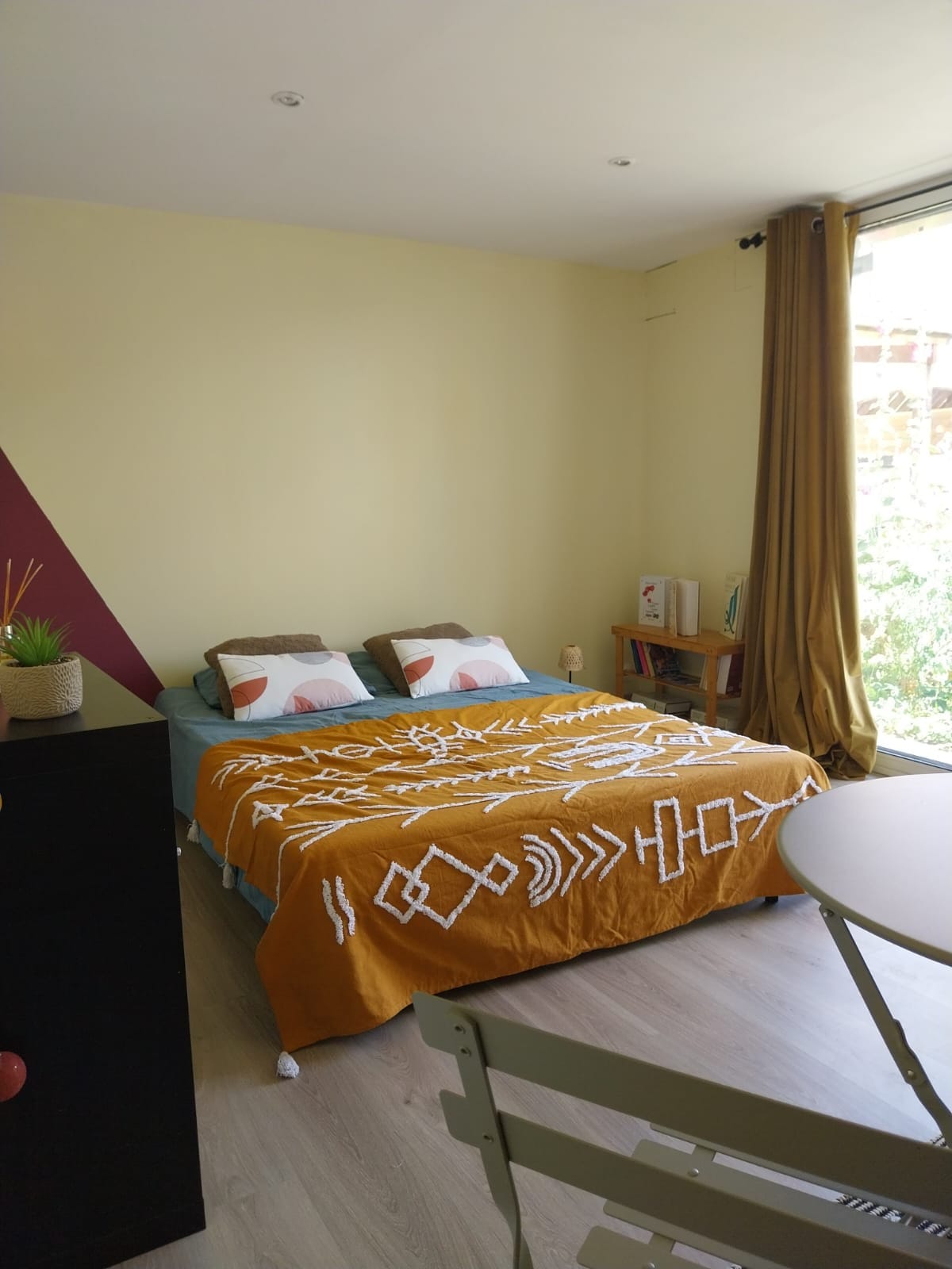 Tá "an t - ardán" os comhair ó dheas le radhairc den ghairdín coille. Tá sé comhdhéanta de: - seomra leapa le 2 bhosca 90 ar leithead faoi 200 ar fhad, le fuinneog le comhla, feistithe le teilifíseán cliste. - leaba thoilg Deis leaba rí le tocht a dhéanamh den seomra seo. - seomra folctha ina bhfuil cithfholcadán, triomadóir tuáille, triomadóir gruaige - limistéar cistine ina bhfuil oigheann, micreathonnán, cuisneoir. - Teilifís 4K - aerchóiriú Línéadach tí agus tuáillí rogha € 10 ar oíche amháin
