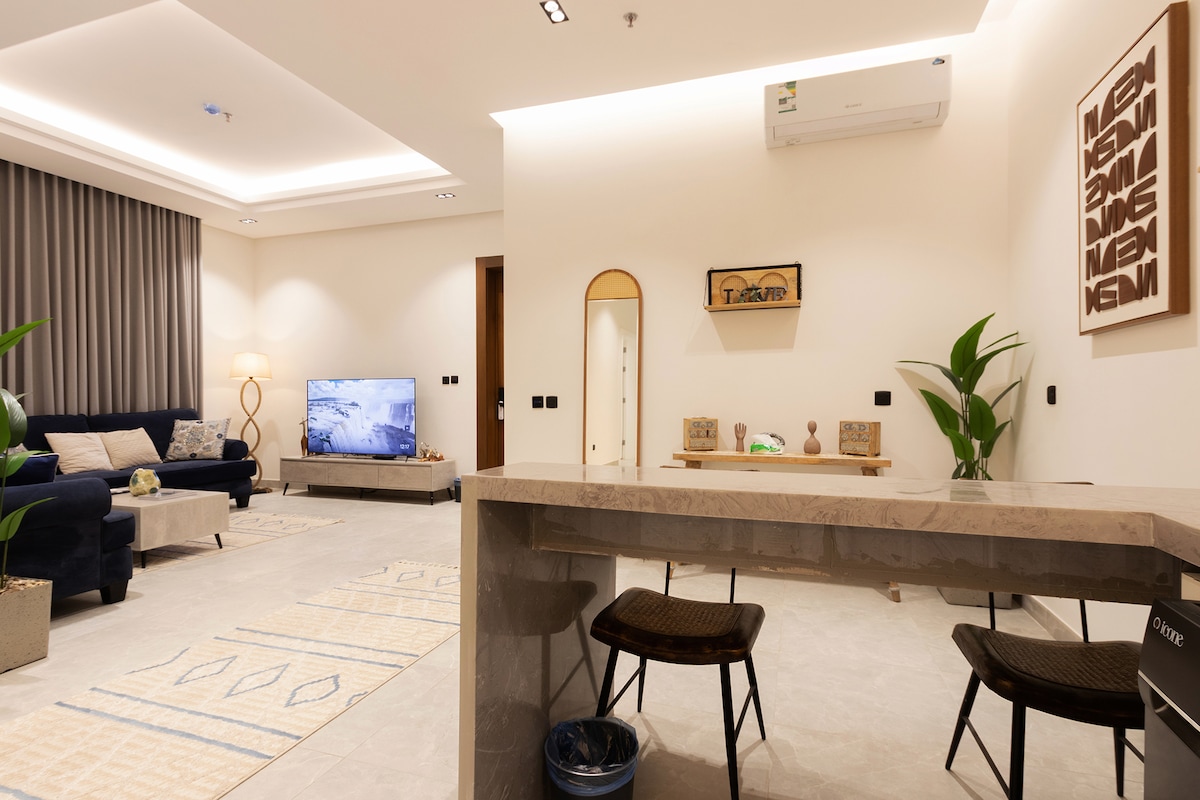 Bain sult as fanacht sa stiúideo teolaí seo atá suite san Al Aqiq, díreach nóiméad ar shiúl ó Boulevard Riyadh, Riyadh Park, agus KAFD. Deartha le compord agus galántacht san áireamh, tá sé foirfe do thaistealaithe gnó agus fóillíochta araon. Timpeallaithe ag na bialanna agus na caiféanna is fearr, le rochtain éasca ar phríomhbhóithre. Feistithe go hiomlán mar áis duit, ag tairiscint compord an bhaile díreach i gcroílár bríomhar Riyadh — le féinseiceáil isteach.