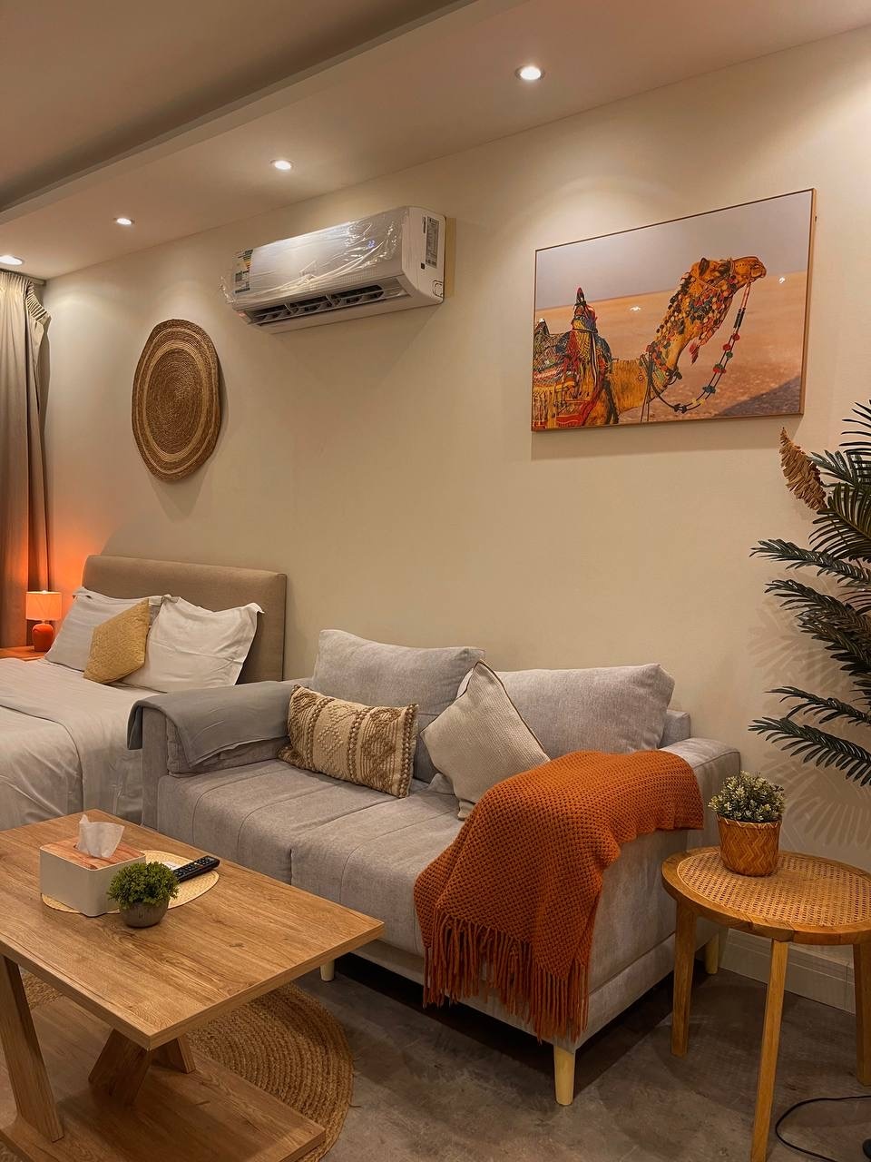 Stiúideo galánta le príobháideacht iomlán agus dearadh uathúil féinshuiteála cliste, meascán de dhathanna compordacha agus seirbhísí iontacha óstáin. Tá seisiún lasmuigh ann freisin ina bhfuil radharc álainn agus cúinne speisialta beárbaiciú a ligeann duit taitneamh a bhaint as an gclós lasmuigh, chomh maith le cistin bheag taobh le cuisneoir, citeal, micreathonnán, agus oigheann cothrom, atá suite i gcomharsanacht Al Aqeeq le suíomh straitéiseach atá an - ghar do Riyadh Boulevard, an t - aerfort, bialanna agus go leor ionad imeachtaí in aice láimhe agus sainiúil