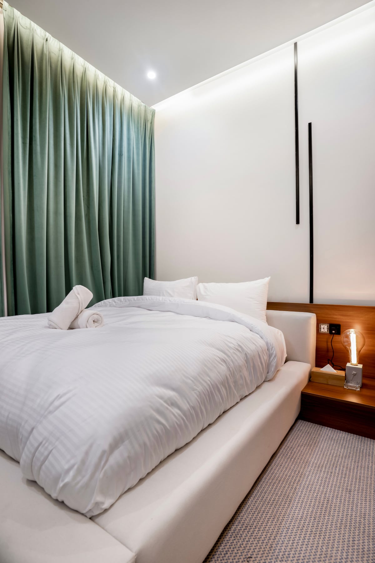Árasán nua - aimseartha atá deartha le haghaidh fanacht eisceachtúil, atá suite i gceann de na comharsanachtaí is fearr in Riyadh agus radharc iontach aige ar KAFD. Tá áit shuíocháin lasmuigh ann ina bhfuil scáileán agus teilgeoir le haghaidh tráthnónta taitneamhacha. Ar mhaithe le do chompord, tá sraith bhreise 14cm ardchaighdeáin sa leaba. “Cuirimid seirbhísí comhordaithe imeachtaí ar fáil freisin le haghaidh ócáidí speisialta (lena n - áirítear císte agus gabhálais) ar tháille bhreise le háirithint a dhéanamh roimh ré, rud a chinntíonn eispéireas dodhearmadta“