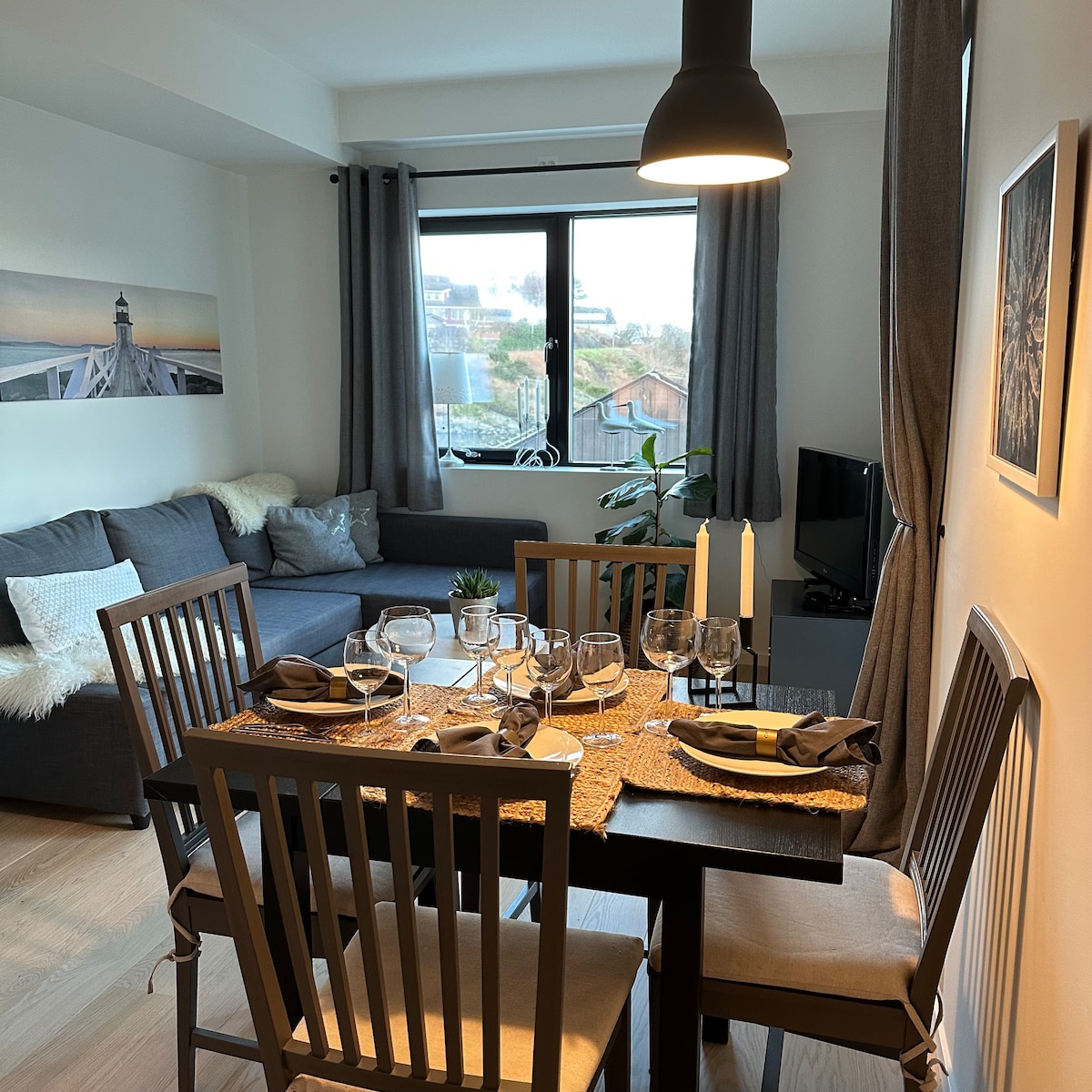 Tá an t - árasán suite ar oileán Engøy, an - ghar do lár Stavanger. Tá stad bus ar an oileán nuair a thabharfaidh an bus no.1 isteach go dtí an baile mór thú agus ní thógann an turas ach 7 nóiméad. Tá radhairc fhairsinge ann ar féidir leat taitneamh a bhaint astu ón árasán. I dtreo amháin feicfidh tú an fjord agus na sléibhte sa chúlra agus i dtreo eile a fheiceann tú i dtreo lár an bhaile agus Gamle Stavanger.