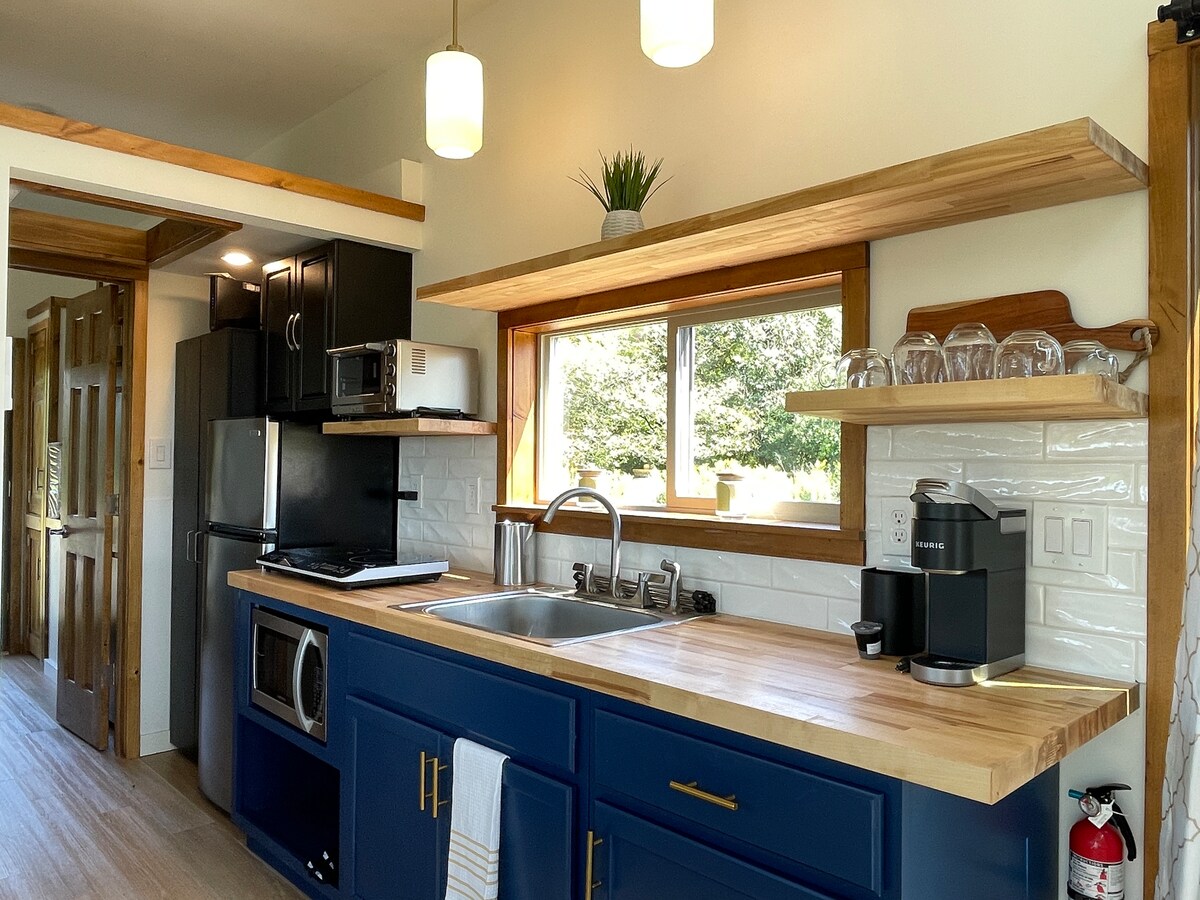 Tír uathúil GuestHouse athchóirithe go healaíonta ó leantóir tarracóra inslithe athchóirithe. Suíomh príobháideach ciúin coillearnaí faoi spéartha oíche réaltaí. Deartha go hiontach chun spás a uasmhéadú do sheomra leapa - leaba bhanríona, limistéar deisce. Seomra folctha iomlán, cistin lánfheistithe, áit itheacháin agus scíth a ligean, lochta compordach le tolg codlata. Tugann an deic mhór ghrianmhar, an paitió scáfar, agus an poll dóiteáin d'eispéireas níos mó lasmuigh. Conair choillearnaí 1.6mi. Turcaithe, sicíní, luibhfheirm. Wi - Fi. Lascaine 10% d'aíonna arís agus arís eile.