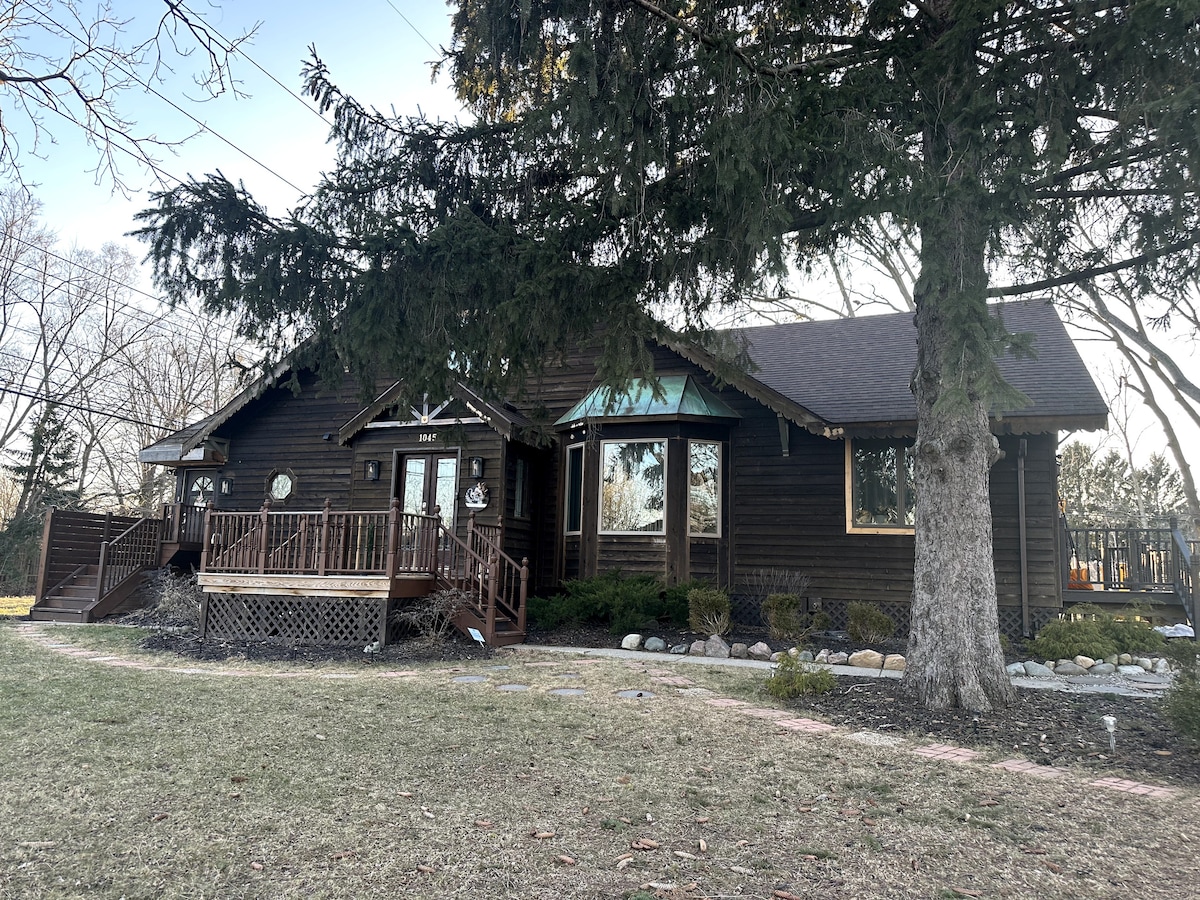 1964 Mid Century A-Frame - romantic getaway. Short walk to lake, large wooded lot, outdoor fire pit, dining, BBQ grill, hot tub & bikes. Large bathroom w/ jacuzzi tub, open floor plan w/ large kitchen & living area w/ electric fireplace. Two upstairs bedrooms. Master has queen sized bed, work space & balcony. Front bedroom w/2 futons & overlooks the living room. Basement game room w/ sauna, pool table, foosball, shuffleboard, Jenga & laundry. Close to shopping, golf, ski resort, cider mill.