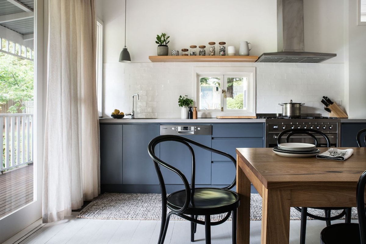 Éalaigh go dtí an Trentham gleoite (1 uair 15min ó Melbourne) agus faigh blaiseadh den mheascán foirfe de dhraíocht thuathúil agus de chompord nua - aimseartha ag ár seomra leapa 3 sheomra leapa mionlach, 2 sheomra folctha le sabhna infridhearg! - gan ach siúlóid 2 nóiméad ó chroílár an bhaile. Lig do scíth cois tine sna míonna níos fuaire. Deartha chun freastal ar theaghlaigh, ar chairde nó ar lánúineacha. Le cistin iomlán, téamh/fuarú duchtaithe, seomra folctha, en - suite. Tá áit chodlata do 8 nduine sa teach seo (2x Banríon, 2x Singil + 1x leaba thoilg dhúbailte). Cuir peataí leis an áirithint, le do thoil