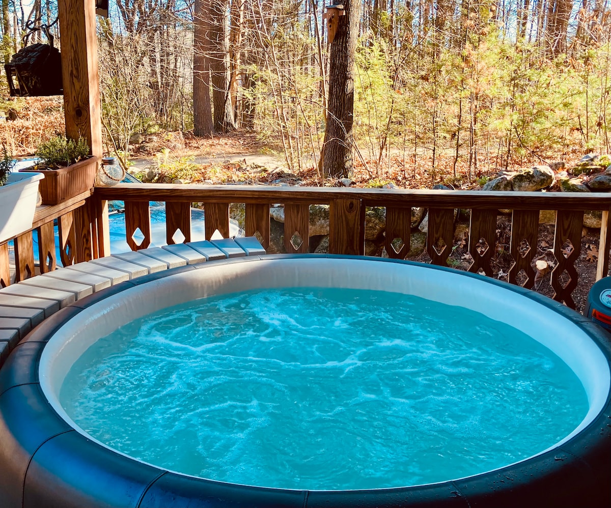 Tá an teach feirme seo athchóirithe as an nua, ina bhfuil feistis sheanda athghinte ón réadmhaoin agus ónár bhfeirm in aice láimhe. Tá sé suite ar 2 acra le neart spáis oscailte, cistin nua - aimseartha gourmet, tobán crúbach coise, agus spásanna suaimhneacha chun do scíth a ligean agus a athnuachan. 10 nóiméad go dtí an trá agus Downtown Portsmouth, 60 nóiméad go Bostún, agus 90 nóiméad go dtí na sléibhte, is spás iontach é an teach álainn príobháideach seo chun bonn iomlán a chur ar bun agus taitneamh a bhaint as an seacoast álainn New Hampshire.