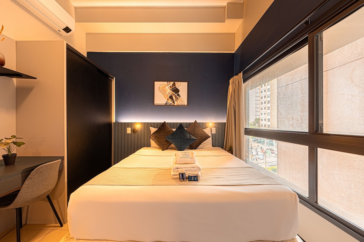 26m² Stiúideo le hailtire sínithe ag maisiú i gcroílár na Jardins. I dtimpeallacht theolaí idéalach do dhaoine atá ag taisteal ina n - aonar, i measc cairde, lánúineacha, agus teaghlaigh a bhfuil páistí acu! Óstálaimid suas le 4 aoi le compord agus solúbthacht Táimid lonnaithe 3 nóiméad ón R cáiliúil. Oscar Freire: sábháilte, lán le bialanna, siopaí, cógaslanna agus margaí I réigiún lárnach, atá oiriúnach do qm tb is mian leat iniúchadh a dhéanamh ar phointí tábhachtacha na cathrach, amhail Páirc Ibirapuera, Ascaill Faria Lima, i measc rudaí eile